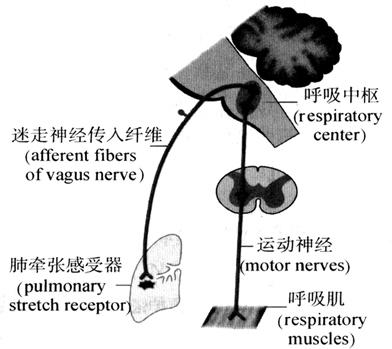 释义 | 呼吸的反射性调节 呼吸的节律是由脑产生的,但是它的活动又受多种因素的影响。体内外各种因素的刺激,主要通过反射活动影响呼吸运动。根据刺激性质和感受器的不同分为机械感受性反射和化学感受性反射。 (一)机械感受性反射1.肺牵张反射(pulmonary stretch reflex) 肺牵张反射又称黑-伯反射(Hering Breuer reflex),它是指肺扩张时反射性地抑制吸气,引起呼气;肺缩小时反射性地抑制呼气,引起吸气。在支气管到细支气管的平滑肌中,存在感受牵张刺激的肺牵张感受器(pulmonary stretch receptor)。吸气时肺扩张,牵拉支气管,使肺牵张感受器兴奋,发出冲动增多,其冲动经迷走神经传入,到达延髓,通过吸气切断机制抑制延髓吸气神经元的活动,使吸气停止转换为呼气。呼气时肺缩小,对肺牵张感受器的刺激减弱,传入冲动减少,解除对吸气的抑制,再次吸气(图7-37)。 图7-37 肺牵张反射示意图 肺牵张反射的意义在于及时终止吸气,使吸气转变为呼气,维持正常的呼吸节律。 肺牵张反射的敏感性有种族差异。动物尤其是兔,这一反射较为明显,如切断动物的双侧迷走神经,出现吸气延长,呼吸深慢。人的这种反射敏感性较低,阻滞人的颈部迷走神经,对呼吸没有明显影响。但在新生儿,这一反射较为明显。在肺炎、肺水肿、肺充血等病理情况下,由于肺的顺应性降低,吸气时对支气管的牵张过强,引起反射,而使呼吸变浅。 2.呼吸肌本体感受性反射 呼吸肌和其他骨骼肌一样也有本体感受器肌梭,当呼吸肌受牵拉时,也可通过本体感受性反射(proprioceptive reflex),使呼吸肌收缩加强。这一反射在平静呼吸时作用不明显,当运动或气道阻力增加时肌梭(muscle spindle)受刺激增强,反射性地引起呼吸肌收缩加强,有助于克服气道阻力。 3.防御性呼吸反射 防御性呼吸反射(protective respiratory reflex)包括咳嗽反射(cOugh reflex)、喷嚏反射(sneezing reflex)。在整个呼吸道都存在感受机械或化学刺激的感受器,它们是分布在黏膜上皮的迷走神经末梢,当受到刺激时引起防御性呼吸反射,清除异物,防止其进入肺内。 除以上反射外还有肺毛细血管旁感受器引起的呼吸反射。 (二)化学感受性调节 血液中PO2、PCO2和H+浓度的改变,都可通过化学感受器,反射性地改变呼吸运动,使呼吸功能适应人体代谢的需要,保持内环境的稳定。 1.低O2对呼吸的影响 在一定范围内低O2,当血液的PO2降到10.67kPa(80mmHg)时,可使呼吸增强,表现为呼吸加深加快,肺通气量增加。低O2引起呼吸增强是通过颈动脉体和主动脉体的化学感受器实现的。 低O2对呼吸中枢的直接作用是抑制,这可能是低O2使中枢神经元代谢障碍引起的。但是低O2也可以刺激外周化学感受器(peripheral chemoreceptor),即颈动脉体和主动脉体的化学感受器,使它们兴奋而产生神经冲动,神经冲动沿窦神经和主动脉神经传到延髓呼吸中枢,使延髓呼吸中枢兴奋。在低O2不严重时,颈动脉体和主动脉体化学感受器使呼吸中枢兴奋的作用比低O2直接抑制呼吸中枢的作用强时,表现为呼吸肌运动神经元传出冲动增加,呼吸肌活动增强,呼吸加深加快。 严重缺O2,动脉血PO2降至5kPa(40mmHg)以下时,外周化学感受器的兴奋作用已不足以抵消缺O2对呼吸中枢的抑制作用,呼吸神经元的活动减弱,出现呼吸抑制,表现为呼吸减弱、减慢,甚至停止。 2.CO2对呼吸的影响 CO2对呼吸的影响比较复杂,随着体内CO2浓度的不同,它对呼吸的影响也不一样。 CO2是呼吸中枢有效的生理刺激物。呼吸中枢对血液中CO2浓度的变化极为敏感。当血液中的CO2浓度低于正常水平时,呼吸中枢的活动减弱,引起呼吸减弱,甚至暂停。在人过度通气时,由于体内CO2被过多地呼出,即可出现上述现象。 当体内CO2增高时随着增高的程度不同,呼吸也出现不同的结果。 吸入气中CO2浓度增高,但是小于10%时,可使呼吸加强,肺通气量增加。体内CO2增加使呼吸增强是通过两条途径实现的。一条是外周化学感受器,CO2和缺O2一样可以刺激外周化学感受器,也通过相同的传入神经将冲动传入延髓呼吸中枢,使它兴奋,引起呼吸增强。另一条是中枢化学感受器(central chemoreceptor),延髓腹外侧的表浅部位对脑脊液中H+浓度变化非常敏感,称为中枢化学感受器。当血液中CO2增加时,CO2能迅速通过血脑屏障进入脑脊液。CO2和H2O结合成H2CO3,H2CO3解离为HCO3-和H+,H+刺激中枢化学感受器使其兴奋,再通过神经联系使呼吸中枢兴奋,进而引起呼吸增强。这两条途径以中枢化学感受器的作用为主,占总效应的80%,但是它的作用出现较外周化学感受器慢。 如果吸入气中的CO2含量超过10%,体内CO2太高时,则抑制中枢神经系统的活动,包括呼吸中枢,出现呼吸困难、头痛、头昏、甚至昏迷,称为CO2麻醉。 3.H+对呼吸的影响 动脉血H+增加可使呼吸加强。其作用途径与CO2相同,也可通过外周化学感受器和中枢化学感受器发挥作用,但是血液中的H+不易通过血脑屏障,所以动脉中的H+变化对中枢化学感受器的影响不大,而主要通过外周化学感受器发挥作用。酸中毒的患者就是因为以上原因而引起呼吸深快的。 动脉血H+减少,碱中毒的患者,呼吸出现浅慢。其作用原理与动脉血H+增加时相反。 以上O2、CO2和H+对呼吸的影响都是从单一因素的影响来讨论的,但是实际情况不可能仅是单一因素的改变而其他因素不变,往往是一种因素的改变会引起其他因素的相继变化,或同时存在几种因素的改变,它们之间互相影响,互