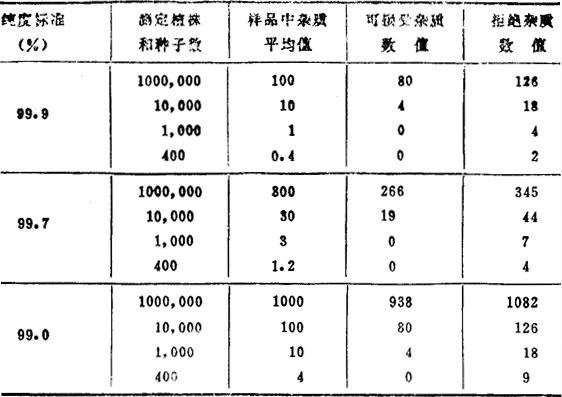 他设计,并列出从1000,000至400范围样品大小的混杂的“接受”(容许)或“拒绝”(不容许)的比例。其品种纯度范围为99.9%。如果样品中的杂质(异品种)数量比该表(表13-1)可“接受”的数值少或相等时,则该品种纯度是可接受的。如果样品中所记录的杂质(异品种)数量大于或等于“拒绝”的数值时,则该品种纯度是不能接受的。如果样品中杂质数量介于“接受”和“拒绝”数值之间,则该品种纯度认为是可疑的。