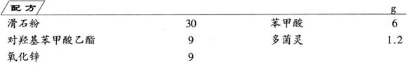 先分别将滑石粉、氧化锌、苯甲酸等原料研磨成细粉,并过250目筛,然后按配比将全部物料混合,搅拌均匀,即得成品。