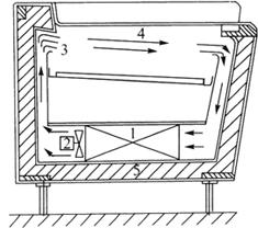 图4-4-29 空气强制流动的冻结物 开式冷藏柜横断面图 1-蒸发器 2-通风机 3-导向片 4-空气幕 5-隔热层 |