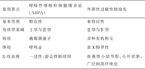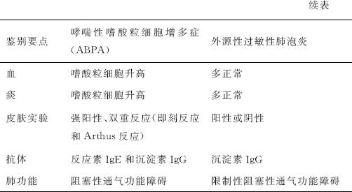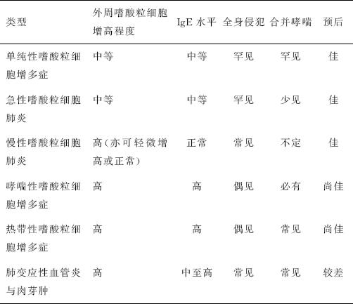 释义 | 嗜酸粒细胞性肺部疾病 一、概述 肺嗜酸粒细胞增多症(pulmonary eosinophilia,PE)又称嗜酸粒细胞综合征和嗜酸粒细胞肺浸润,指不同病因引起的肺部嗜酸粒细胞浸润,伴(或不伴)有周围血和痰嗜酸粒细胞增多的一组疾病。临床上主要分为单纯性肺嗜酸粒细胞浸润症、急性嗜酸粒细胞肺炎、迁延性肺嗜酸粒细胞浸润症(慢性嗜酸粒细胞性肺炎)、哮喘性嗜酸粒细胞增多症、热带性嗜酸粒细胞增多症、肺变应性血管炎与肉芽肿等类型;各型常交叉重叠,临床上不易截然划分。 二、流行病学 本组疾病并不少见。对各类型疾病的发病率、年龄分布、发病的季节性和区域性的研究,各家结果也不尽相同。 1.发病率 本组疾病中,慢性嗜酸粒细胞肺炎少见。至20世纪90年代,国外报道约百余例;在国内,北京协和医院在1990年报道1例经纤维支气管镜肺活检确诊的CEP。哮喘型肺嗜酸粒细胞增多症在世界各地均有发生,北京协和医院近年报道的有完整资料记载者有30余例。 2.年龄分布 肺嗜酸粒细胞增多症可以发生在各个年龄段。流行病学调查显示,急性嗜酸粒细胞肺炎好发于年轻男性,30岁以下者占多数;慢性嗜酸粒细胞性肺炎多发生于30~40岁年龄阶段,男女之比为1∶2;1/3~1/2的患者有过敏史(变应性鼻炎或鼻息肉),2/3以上患者发病前数月有支气管哮喘发作或伴有其他呼吸系统症状;哮喘性嗜酸粒细胞增多症40~60岁起病,女性多见;肺变应性血管炎与肉芽肿,发病年龄多为20~40岁,男性多于女性。 3.发病情况 本组疾病以单纯性肺嗜酸粒细胞浸润症症状轻,病程呈自限性,常可自行痊愈;以肺变应性血管炎与肉芽肿病情较重,预后差。尸检证实因充血性心力衰竭及心肌梗死病死率达48%;由肾衰竭或神经系统疾病病死率为18%;因消化道出血及穿孔、哮喘持续状态及呼吸衰竭致死约各占10%。 4.发病的季节性和区域性 Nishino等人在报道中强调,急性嗜酸粒细胞肺炎发病的季节为春季至晚夏;热带性嗜酸粒细胞增多症,多分布于热带和亚热带,发病与丝虫感染和过敏密切相关。 三、病因 1.单纯性肺嗜酸粒细胞增多症 主要病因为寄生虫感染和药物反应引起的肺部一过性变态反应。寄生虫中以蛔虫感染最为常见,还可见绦虫、钩虫、旋毛虫、阿米巴原虫、日本血吸虫、丝虫和华支睾吸虫等感染;药物包括对氨水杨酸、阿司匹林、青霉素、各种磺胺制剂、呋喃妥因、甲氨蝶呤、博来霉素、异烟肼、链霉素、噻嗪类利尿剂、金制剂、硫唑嘌呤、氯磺丙脲、哌醋酯和美呈明等;有时吸入花粉、真菌孢子,接触铍、镍也能发病。 2.急性嗜酸粒细胞肺炎 病因尚不明确,可能与其他嗜酸粒细胞肺浸润(PIE)相似,是由于吸入或接触某种抗原所致的变态反应,抗原包括寄生虫、霉菌和各种病毒的感染;也可能和吸入或服用某些毒物或药物有关,例如海洛因、戊烷咪、对乙酰氨基酚、呋喃妥因等。 3.慢性嗜酸粒细胞肺炎 病因不清,认为与曲霉感染和结缔组织病有关。 4.哮喘性嗜酸粒细胞增多症 多因曲霉引起;此外,青霉属、念珠菌属、毛霉菌属、药物和镍烟雾亦可引起本病。 5.热带性嗜酸粒细胞增多症 发病与丝虫感染引起的变态反应有关。 6.肺变应性血管炎与肉芽肿 病因尚未明确,目前多认为是自身免疫性疾病,亦可能与病毒感染有关,而遗传、家族史和寄生虫感染致病的证据不足。 四、发病机制 本组疾病与异常的免疫反应有关。 1.单纯性嗜酸粒细胞增多症 本病与Ⅰ型变态反应有关,而Ⅲ型变态反应也可参与。 2.急性嗜酸粒细胞肺炎 与单纯性酸粒细胞增多症发病机制相似。 3.慢性嗜酸粒细胞肺炎 发病可能与Ⅲ型、Ⅳ型变态反应协同作用有关,也可由Ⅱ型变态反应所致。 4.哮喘性嗜酸粒细胞增多症 与IgE和沉淀素介导的Ⅰ型和Ⅲ型变态反应有关。患者血清IgE含量高达1000~20 000U/ml。其免疫反应特点是增强的多克隆抗体反应,表现为在免疫球蛋白介导下,IL-4、IL-5、IL-6等细胞因子释放氧自由基和花生四烯酸代谢产物等,淋巴细胞致敏,补体活化,最后引起组织损伤。 5.热带性嗜酸粒细胞增多症 患者血清中存在抗丝虫抗体;血清补体结合实验呈强阳性反应,抗丝虫治疗后效价降低。本病与Ⅰ型、Ⅲ型变态反应有关,亦可能与Ⅳ型变态反应协同作用有关。 6.肺变应性血管炎与肉芽肿 主要由Ⅲ型、Ⅳ型变态反应引起。 五、分类 本组疾病的病因仍未完全明了,因此根据临床特点将本病分为下列5种类型(表5-3)。各类型间分界有时不甚明确,在病程中甚至有相互转化的可能。 表5-3 嗜酸粒细胞性肺部疾病分类 六、检查 1.胸部X线检查 是诊断和鉴别本组疾病类型的关键检查项目之一。 (1)单纯性嗜酸粒细胞增多症:表现为单侧或两肺周边可见边缘模糊、大小不等较淡的斑片状阴影,呈短暂游走性,多在1~2周内消失,而又可在其他部位出现,以下肺野分布多见。 (2)急性嗜酸粒细胞肺炎:胸部X线表现为肺野弥漫性薄雾状阴影;并可出现两侧或单侧少量胸腔积液,以双侧多见;也可出现慢性嗜酸粒细胞肺炎样的肺外周斑片状阴影。40%~50%的患者可见KerleyB线和A线,纵隔淋巴结肿大,但心影多正常。胸部CT检查表现为弥漫性毛玻璃状、片状或网状阴影、小叶间隔肥厚及胸腔积液,但小叶间隔肥厚在过敏性肺炎和急性间质性肺炎上往往不存在,这点有助于鉴别。 (3)慢性嗜酸粒细胞肺炎:呈非肺段性边缘不清的肺浸润影,多见于肺外周,以中上肺野之