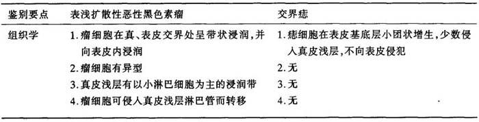 释义 | 四、恶性黑色素瘤 (一)恶性黑色素瘤(malignant melanoma) 临床:好发于脚底、颈后部、手等易受摩擦之处。另外在视网膜、口腔、肛门及阴道等处粘膜亦可发生,有原发与继发两种。继发灶是在原有色素痣基础上,突然色素加深,产生卫星病灶或溃疡。 组织学:瘤细胞可分树突状,上皮样,小痣样,梭形及畸形多种形态,混合成不规则片状或弥漫浸润,有不同程度的异型性,上皮样与梭形细胞可某一成分占优势,色素可多,可少,甚至没有(无色素性)。瘤细胞单个明显核仁,“豆芽状”。双叶核,总的形态非癌非肉瘤(四不像)状为其特征。如为无色素性,必须作免疫组化确定。肿瘤一般从表皮向真皮、皮下垂帘式弥漫浸润。其早期病变限于真皮浅层,称浅性扩散恶性黑色素瘤。 【鉴别诊断】 由于其组织形态多变,其鉴别诊断分两部分:①与良性色素痣鉴别(表12-8);②与其他恶性肿瘤鉴别:主要是与无色素性恶性黑色素瘤未分化癌、间变性大细胞淋巴瘤、多形性横纹肌肉瘤、恶性神经鞘瘤等鉴别,则应借助于各种肿瘤的特异性抗体及电镜。 表12-8 良性色素痣与恶性黑色素瘤的鉴别诊断 1.躯干浴痣 临床与组织学改变同巨大毛发色素痣,在罕见的情况下可以发生恶变,由于痣巨大,无法做预防性切除。 2.发育异常痣综合征又称为B-K痣或Clark痣 临床特点:痣较大,5~15mm淡黑色,界限不清,好发于躯干,中轻年人多见。 组织学:①为复合痣;②表皮内损害境界不清,在边缘外仍见较多单个痣细胞向水平伸展;③真表皮交界处偶见不典型痣细胞;④真皮乳头层内有痣细胞巢及少量炎细胞浸润。 3.恶性雀斑(Hutchinson’s freckle) 临床:①好发于老年人面部,为色素不均匀斑,逐渐扩大,可达数厘米,边缘不规则,边扩展边自行消退;②生长缓慢,预后较好,部分转化为恶性黑色素瘤。 组织学:①早期表皮突变平,基底层至表层甚至角化层色素增多,真表皮交界处黑色素细胞增多并排列紊乱,核明显异型性,胞浆透明,可见黑色素颗粒;②进一步发展,基底层异型痣细胞巢向表皮上层发展,真皮浅层有噬黑色素细胞及炎细胞浸润;③晚期发展为恶性黑色素瘤,真表皮交界处异型黑色素细胞排列成巢,可见局灶性向真皮浸润。 4.表浅扩散性恶性黑色素瘤 临床:①年轻人多见,好发于躯干及下肢,预后好;②病变形状不规则,色素分布不均,界限不清。 组织学:①单个或成巢细胞不规则分布于整个表皮,常累及表皮上层;②细胞大、胞浆丰富,核呈不规则空泡状,伴突出的嗜酸性核仁,类似Paget病;③肿瘤的浸润是常见的,应多做切片,原位恶性黑色素瘤的诊断应慎重。 5.巨大毛发色素痣(giant hairy‘bathing trunk’naevi) 临床:①出生即有,非遗传性病变;②斑块呈黑色,微隆起伴有毛发,大小不一,形状不规则,周围见卫星灶;③10%患者发生恶变。 组织学:①基本病变:复合痣、皮内痣、蓝痣或神经样痣(梭形痣细胞排列呈神经管样结构)混合存在,以一种为主;②恶变发生于真皮与表皮交界处或真皮下部。在交界处,病变同一般黑色素瘤;在真皮深部,瘤细胞类似未分化细胞,无或极少黑色素。 6.幼年性黑色素瘤(Spitz’s痣) 临床:皮损小于0.6cm,境界清,原顶无毛,色素少。多见于面部和四肢,儿童多于成人。 组织学:①痣细胞生长活跃,核大、核仁显着,细胞具有不典型性,可见多核巨细胞,不典型核分裂象少见;②痣细胞排列呈巢,表皮边缘痣细胞巢周围可见均一的嗜酸性小体;③部分病例真皮上部水肿和毛细血管扩张致痣细胞巢松散;④真皮层有炎细胞浸润带。 鉴别诊断:尚属良性痣,但细胞活跃,应与恶性黑色素瘤鉴别。 (二)恶性前或早期恶性黑色素病变 二者病变均在真表皮交界处,但良、恶性有别,应注意鉴别(表12-9)。 表12-9 表浅扩散性恶性黑色素瘤与交界痣的鉴别 (三)痣样病变 1.表皮痣 临床:又称疣状痣,分为三型。限局型:线状损害由密集的乳头状角化性丘疹组成,单侧分布;炎症型:好发于一侧下肢,由疣状红色丘疹组成,表面缩小;系统型:皮损同限局型,多发,可伴有骨骼畸形及中枢神经系统疾病。 组织学:限局型:角化过度,棘层增厚,皮突增长。真皮乳头瘤样增生,致表皮疣状增生。可伴发皮脂腺痣或乳头状汗管囊腺瘤。炎症型:同限局型,可见间隙性角化不全及真皮浅层慢性炎细胞浸润。系统型:同限局型。若为高起鱼鳞病者,有表皮松解性角化过度。 2.毛发色素性表皮痣(Becker痣) 临床:①色素改变出现在10~20岁,25岁后不再发展;②好发于肩背、前胸及上臂,单侧性,颜色逐渐加深;③色素斑上有毛发。 组织学:实际上是一种错构痣,病变在表皮及附属器。①表皮轻度增生并呈乳头状,表皮突增宽;②基底层黑色素细胞数目正常,黑色素增加,真皮乳头见噬色素细胞。③毛囊数及立毛肌数增多。 3.皮脂腺痣 临床:①本病为皮脂腺增生性病变,出生时或出生后不久发生;②常见于头面部,呈蜡黄色微隆起斑块,表面无毛,常单发。 组织学:①表皮乳头瘤样增生;②青春期之前,皮脂腺小而少;青春期之后,见大量成熟的皮脂腺;③毛囊未完全分化或缺如。 |