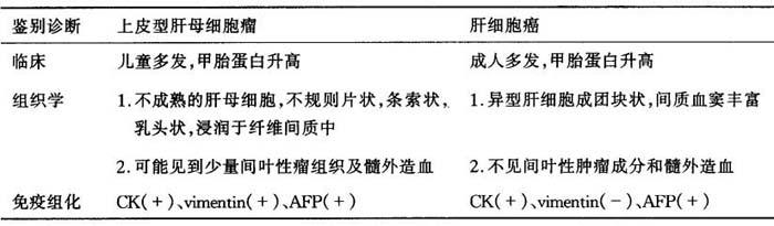 释义 | 四、肝母细胞瘤与肝细胞癌的鉴别 肝母细胞瘤较少见,好发于儿童,也有甲胎蛋白升高,临床很难与肝细胞癌区别。组织学方面分上皮型与混合型,后者除有不成熟的肝母细胞以外,尚可见到未分化间叶成分或骨与软骨肿瘤,比较易于识别。而上皮型肝母细胞瘤与肝细胞肝癌不易区别。鉴别如表3-22。 表3-22 上皮型肝母细胞瘤与肝细胞肝癌的鉴别 |