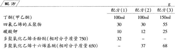 配方(1)制法:将配方(1)中各组分的混合物在60℃下搅拌8h,然后冷却,过滤,在蒸发器中除去溶剂,得淡黄色黏稠液体。红外吸收光谱分析显示产品无残留的-OH基存在,且存在-C10F19基,经核磁共振分析证实产品的结构式为: