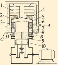 释义 | 回热式气体制冷机 在空气制冷机的基础上发展起来的一种制冷机。 在工质的压缩缸与膨胀缸之间布置一个热量交换设备,称“回热器”或“蓄冷器”。高压高温的工质由压缩缸流至膨胀缸时,其部分热量被回热器中的填料吸收,工质温度降低,到膨胀缸内工质膨胀产生冷效应,并通过热交换器吸取外界热量。低压低温的工质由膨胀缸回流至压缩缸时则自回热器填料吸取热量而温度升高。因采用回热器,工质的循环效率得以提高。 回热式气体制冷机原理图 1.水汽分离孔盘 2.绝热层 3.热交换器 4.液化气体冷凝器 5.膨胀缸 6.膨胀活塞 7.回热器 8.制冷剂(气体) 9.压缩缸 10.压缩活塞 A.空气进 B.冷却水进 C.液化气体出 D.冷却水出 |