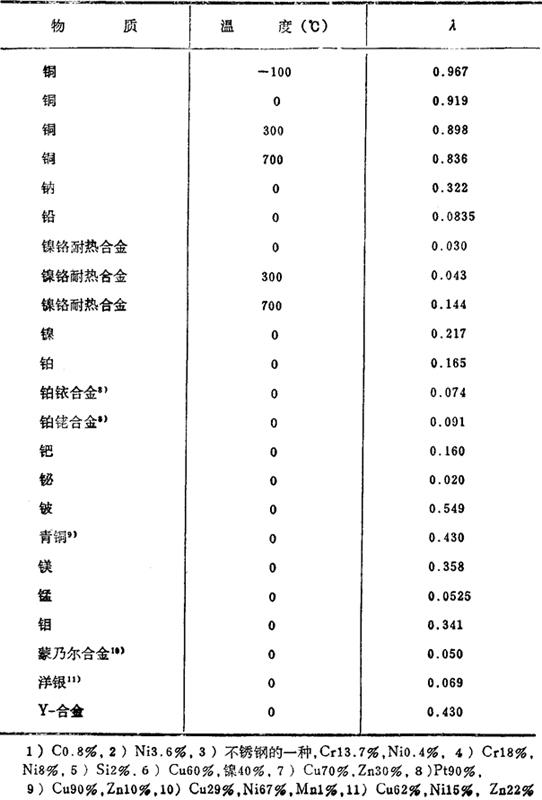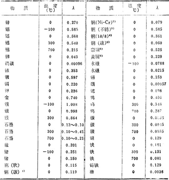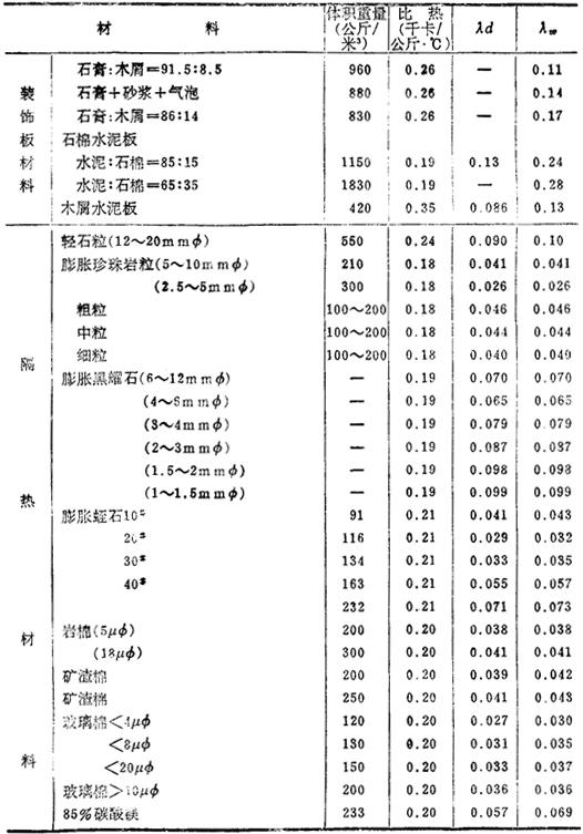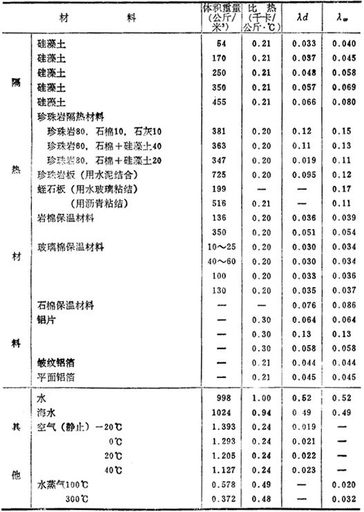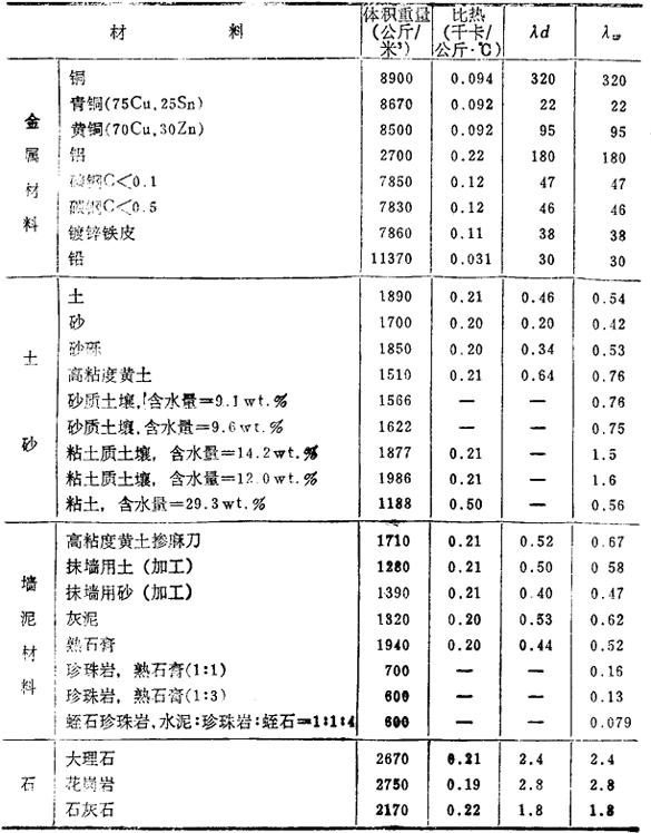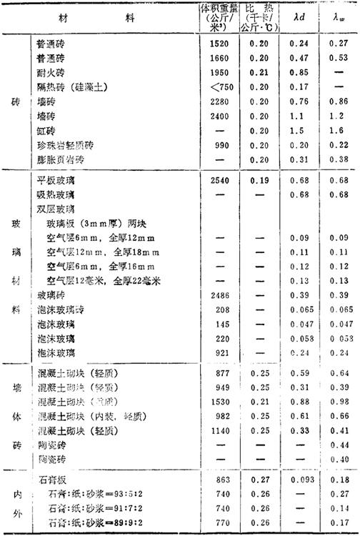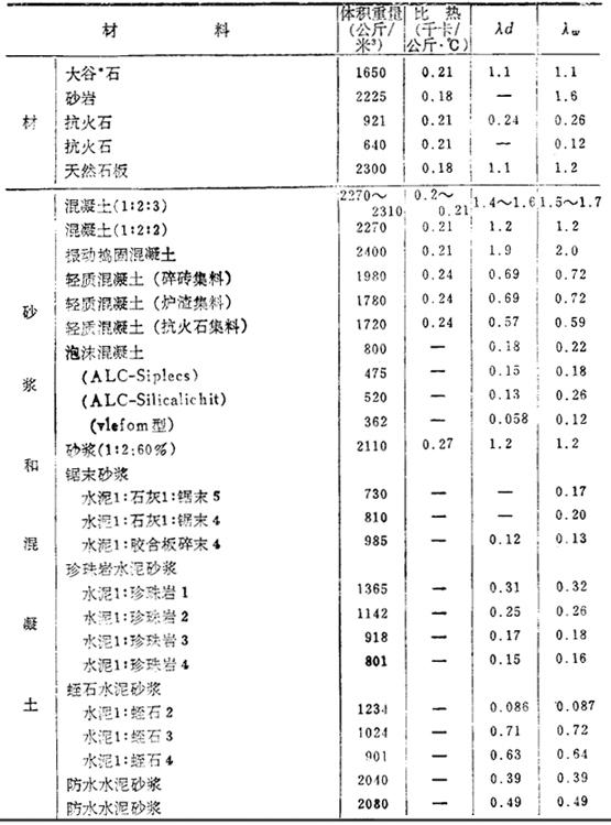 释义 | 固体的导热系数 导热系数λ是表示在1厘米厚的板的两面有1℃温差时,在1秒钟内通过该板1厘米2的热量。在C.G.S.单位制中,以卡/厘米·秒·℃(Cal/cm·sec·℃)表示。 a.元素与金属 b.各种建筑材料 导热系数是以工业单位千卡/米·小时·℃(kcal/m·hr·℃)表示,λd是干燥值,λw是湿度为75%时的值,温度均为20℃。 *大谷——日本地名——译注. |