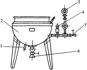 1-冷凝水排出管 2-锅体 3-压力表 4-安全阀 5-进汽管 6-排料阀