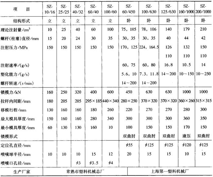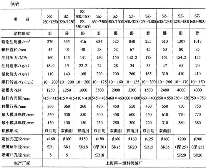 释义 | 国产注塑机技术规范 模具只有和合适的注塑机相配,生产才能正常进行。从模具设计的角度考虑,需了解的注塑机技术规范的主要项目有:注塑机的类型、最大注射量、最大注射压力、最大锁模力、模具安装尺寸及开模行程等。典型国产注塑机主要技术规范如表2-1所示。设计模具时,应根据具体的注塑机生产厂提供的“注塑机使用说明书”标明的技术规范进行,因为同一规格的注塑机,生产厂家不同,其技术指标也略有不同。 表2-1 部分国产SZ型塑料注塑成型机主要技术参数 |