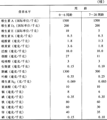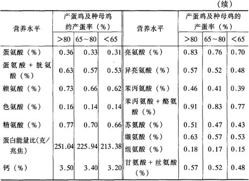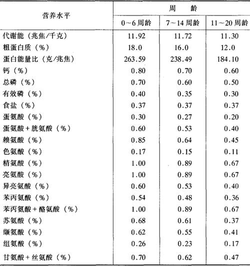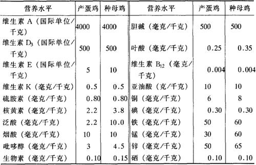 释义 | 国内蛋鸡饲养标准(国家标准) 1.生长期蛋用鸡的饲养标准(表5-11) 表5-11 生长期蛋用鸡的饲养标准 2.产蛋期蛋用鸡及轻型种母鸡的饲养标准(表5-12、13) 表5-12 产蛋期蛋用鸡及轻型种母鸡的饲养标准 表5-13 产蛋期蛋用鸡的维生素、亚油酸及微量元素需要量 |