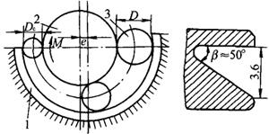 原料罐盖直径为D,圆边后成品罐盖直径为Dc。罐盖回转轨道应该是变直径,为此将罐盖进口至出口处孔道制成以圆盘中心为基准的偏心孔道,偏心度e=D-Dc,以保证圆边外模1和圆边内模2之间距离等于罐盖3圆边时的直径。