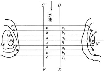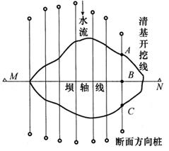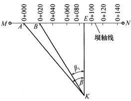 释义 | 土坝的施工放样 土坝具有可就地取材、施工简便的特点。建筑土坝时的施工放样其内容包括:坝轴线的测设,坝身控制测量,清基开挖线、坡脚线的放样,坝体边坡线的放样及修坡桩的测设等。 1.坝轴线的测设 .对于中、小型土坝的坝轴线位置,一般由工程设计和勘测人员组成选线小组,根据坝址的地质和地形情况,经过方案比较,在现场直接选定。 当坝轴线的两端点在地面确定后,应埋设永久性标志。为了防止施工时端点被破坏,可用经纬仪将其向两端延长到不受施工干扰、易于保存的地方。 2.坝身控制测量 坝轴线是土坝施工放样的主要依据,但是,要进行土坝的细部放样时,在施工干扰较大的情况下,仅有一条轴线是不能满足施工需要的,因此,还必须进行坝身控制测量。坝身控制测量包括平面控制测量和高程控制测量。 (1)平面控制测量 1)平行于坝轴线的控制线的测设 如图13-15所示,M、N是坝轴线的两个端点,M′、N′是轴线上的引桩。将经纬仪设置在M点,照准N点,固定视线,向河床两侧平坦的地面上定出A、B两点。测设时应分别在坝轴线的端点A、B安置经纬仪,定出坝轴线的两条垂线CF和DE,在垂线上按规定的轴距(如5m、10m、20m、30m等)用钢尺丈量出各平行控制线距坝轴线的距离,得各平行线的位置a,b…点,然后用木桩在实地标定。在B点安置经纬仪的方法与A点安置经纬仪测设基本相同。同理可定出a′,b′,…点,aa′,bb′,…直线即为坝轴线AB的平行线,把各平行线延长到两边山坡上,并埋设标志。 图13-15 轴线平行线测设图 2)垂直于坝轴线的控制线的测设 垂直于坝轴线的控制线一般按每隔10~20m设置。通常是将坝轴线上与坝顶设计高程一致的地面点作为坝轴线里程桩的起点,称为零号桩。其桩号为0+000,从零号桩起,每隔一定距离分别设置一条垂直于坝轴线的直线。 测定零号桩的方法,如图13-16所示,在坝轴线端点M附近安置水准仪,后视水准点上的水准尺,得读数为a,则零号桩上的应有读数b可按下式计算,即 b=(H0+a)-H顶 式中 b——零号桩上水准尺的读数(m); H0——水准点的高程(m); H顶——坝顶的设计高程(m)。 在坝轴线的另一个端点N上安置经纬仪,照准M点,固定照准部,扶尺员持水准尺在经纬仪视线方向沿山坡上、下移动,当水准仪中丝读数为b时,则该立尺点即为坝轴线上零号桩的位置。 图13-16 测定坝轴线的控制线里程桩 零号桩位置确定后,可沿坝轴线由0+000起按选定的距离(图13-16中为20m)丈量,并顺序钉里程桩,其桩号依次为0+020,0+040,…,直至另一端坝顶与地面的交点为止。当地面坡度较陡,直接丈量里程有困难时,可用交会法测设出适当位置P,该点应位于下游或上游便于测距的地方,在E点测设垂直线EK,并精确丈量EK距离。观测水平角β,计算AE的距离为: 如果要测设0+020的里程桩,可用下式算得β1角,即 再用两台经纬仪,分别安置于K和N点。设在N点的仪器照准M点,固定照准部;设在K点的仪器测设角β1;两台仪器视线的交点即为B点。其他里程桩可按上述方法放样。 在各里程桩上分别安置经纬仪,照准坝轴线上较远的一个端点M或N,照准部旋转90°,即可得到一系列与坝轴线垂直的直线。将这些垂线也投测到围堰上或山坡上,用木桩或混凝土桩标志各垂直线的端点。这些端点桩称为横断面方向桩,它们是施测横断面以及放样清基开挖线、坝坡面的控制桩。 (2)高程控制测量 用于土坝施工放样的高程控制,除在施工范围外布设三等或四等精度的永久性水准点外,还应在施工范围内设置临时性水准点。临时性水准点应布置在施工范围内不同高度的地方,以便安置1~2次仪器就能放出需要的高程点。临时水准点应根据施工进度及时设置,并与永久水准点构成附合或闭合水准路线,按等外精度施测。 3.清基开挖线的放样 清基开挖线就是坝体与地面的交线。为了使坝体与地面紧密结合,在坝体填筑前,必须清除坝基自然表面的松散土壤、树根等杂物。在清理基础时,为了不超量开挖自然表土、节省人力物力,测量人员应根据设计图,结合地形情况放出清基开挖线,以确定施工范围。 放样清基开挖线,一般可用图解法量取放样数据。如图13-17所示点在坝轴线上的里程为0+080,A、C为坝体的设计断面与地面上、下游的交点,量取图上BA、BC的距离为d1、d2。放样时,在B点安置经纬仪,定出横断面方向,从B点分别向上、下游方向测设d1、d2,标出清基开挖点A和C。用上述方法定出各断面的清基开挖点,各开挖点的连线即为清基开挖线,如图13-18所示。由于清基开挖有一定的深度和坡度,所以应按估算的放坡宽度确定清基开挖线。当从断面图上量取di时,应按深度和坡度加上一定的放坡长度。 图13-17 图解法放样清基开挖点的数据 图13-18 标定清基开挖线 4.坡角线的放样 清基以后,应放出坡角线,即坝体与地面的交线,以便填筑坝体。下面介绍两种放样方法。 (1)平行线法 坝身控制测量时,设置平行于坝轴线的直线,其与坝坡面相交处的高程可按下式计算,即 式中 Hi——第i条平行线与坝坡面相交处的高程(m); H顶——坝顶的设计高程(m); di——第i条平行线与坝轴线之间的距离,简称轴距(m); b——坝顶的设计宽度(m);
