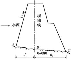 各条平行线与坝坡面相交处的高程经计算后,即可在各平行线上用高程放样的方法测设Hi的坡角点,具体的施测方法与测定轴线上零号桩位置的方法相同。 各个坡脚点的连线,即为坡体的坡角线。但是,为确保坡面碾压密实,一般坡脚处填土范围应当大一些,多余的填土部分称为余坡,余坡的厚度取决于土质及施工方法,一般为0.3~0.5m。 (2)趋近法 清基完工后,先恢复坝轴线上各里程桩的位置,并测定桩点地面高程;将经纬仪安置于各里程桩上,定出各断面方向;在断面方向上的坡脚点附近(可根据设计断面预先估计距离)立尺。用视距法测定立尺点的轴距d′及高程 式中 b——坝顶设计宽度; m——坝坡面设计坡度的分母; H顶——坝顶设计高程; 图13-19 趋近法标定坡脚点 若计算的轴距d与实测的轴距d′不等,说明该立尺点A′不是该断面的坡脚点。应在断面方向移动立尺点的位置,重复上述的观测计算。经几次试测,直至实测的轴距与计算的轴距之差在容许范围内为止,这时的立尺点即为坡脚点。按上述方法,施测其他断面的坡脚点。 5.坝体边坡线的放样 坝体坡角线放出后,即可在坡角线范围内填土,土坝施工时是分层上料,每层填土厚度约0.5m,上料后即进行碾压,为了保证坝体的边坡符合设计要求,每层碾压后应及时确定上料边界。各个断面上料桩的标定通常采用轴距杆法或坡度尺法。 (1)轴距杆法 根据土坝的设计坡度,按上式计算坝坡面不同高程点至坝轴线的距离,该距离为坝体筑成后的实际轴距。放样上料桩时,必须加上余坡厚度的水平距离为△di=d轴-di,据此可定出上料桩的位置。随着坝体增高,轴距杆可逐渐向坝轴线移近,如图13-20所示。 图13-20 轴距杆法放样上料桩 1-轴距杆;2-上料桩;3-坝轴线;4-里程桩;5-第一层填土 (2)坡度尺法 坡度尺是根据坝体设计的边坡坡度用木板制成的直角三角形尺。例如,坝坡面的设计坡度若为i=1∶2,则坡度尺的一直角边长为1m,另一直角边应为2m,即构成坡度为1∶2的坡度板。在较长的一条直角边上安装一个水准管。放样时,将绳子一头系于坡脚桩上,另一头系在坝体横断面方向的竹竿上,将三角板斜边靠着绳子,当绳子拉到水准气泡居中时,绳子的坡度即等于应放样的坡度,如图13-21所示。 图13-21 用坡度尺放样边坡 6.修坡桩的测设 坝体修筑到设计高程后,要根据设计的坡度修整坝坡面,修坡是根据标明削去厚度的修坡桩进行的。修坡桩常用水准仪或经纬仪施测。 (1)水准仪法 在已填筑的坝坡面上,钉上若干排平行于坝轴线的木桩。木桩的纵、横间距都不易过大,以免影响修坡质量。用钢卷尺丈量各木桩至坝轴线的距离,并计算桩的坡面设计高程。 用水准仪测定各木桩的坡面高程,各点坡面高程与各点设计高程之差即为该点的削坡厚度。 (2)经纬仪法 首先依据设计坡度计算出坡倾角。例如,当坝坡面的设计坡度为i=1∶2时,则坡面的倾角为: 在填筑的坝顶边缘上安置经纬仪,量取仪器高度i。将望远镜视线向下倾斜α,此时视线平行于设计坡面。然后,沿视线方向每隔几米树立标尺,设中丝读数为v,则该立尺点的修坡厚度为: δ=i-v 若安置经纬仪地点的高程与坝顶设计高程不符,则计算削坡量时应加改正数,如图13-22所示。此时,实际修坡厚度应按下式计算,即 δ′=(i-L)+(H测-H设) 式中 i——经纬仪的仪器高(m); L——经纬仪的中丝读数(m); H测——安置仪器的坝顶实测高程(m); H设——坝顶设计高程(m)。 图13-22 用经纬仪测定修坡量 |