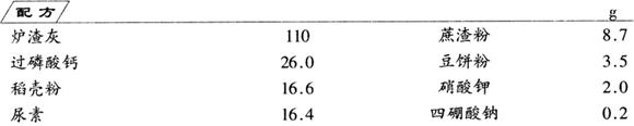 按要求将稻壳、豆饼、蔗渣、炉渣灰碎成粉状,然后将粉状物和其余原料混合均匀,即成产品。使用时,每亩使用量一般为10kg左右。