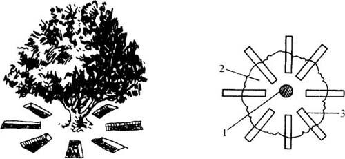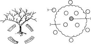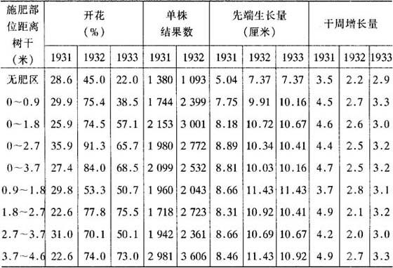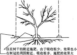 释义 | 土壤施肥(根际施肥) 根部施肥必须掌握根系的生长、分布、吸收特性,才能将肥料施到最适宜的吸收部位,充分发挥肥料的最大效能。 (一)施肥部位 一般果树水平根的分布要比树冠扩展范围广而远,往往超过树冠直径的1~2倍;垂直根多在100厘米范围内。吸收水分和养分的细根,水平方向多分布在树冠稍远处,垂直方向多密集于20~40厘米之间。所以将肥料均匀地施在根系密集层为最理想(图5-9、图5-10)。由于根系具有趋肥性,生长方向常以施肥部位而转移,因此,将肥料施在比根系集中分布的位置略深稍远些,可诱导根系向纵深发展,扩大吸收面积,以增强树体的抗逆性。施肥深度和广度随树种、品种、树龄、环境条件、栽培技术和肥料种类等而变化。幼树根系浅,分布范围小,以浅施为宜。树龄大,根系扩展范围广,扎得深,应扩大施肥范围和深度。 图5-9 树冠与根系的分布关系 图5-10 桃树养分、水分上升的路径 据对25年生的苹果树进行施肥部位试验,除无肥区外,在树干附近(0~0.914米和0~1.829米)施肥的树体表现最差,叶色浅,落叶早。而在树冠外缘或稍外缘的效果最好(表5-35)。 表5-35 施肥部位对果树生长和结果的影响 (Marth,1935) 注:①品种:Rome,25年生,树冠直径3.35米。②硝酸铵施入量:4.54千克/株。 (二)施肥方法 1.理论依据 果树根系的生长,具有向肥性。由于施肥方法不同,根系分布也有很大差异。例如佐须(1934)对成年苹果园采用全园施肥和轮状施肥,结果表明:全园施肥区各类根量多,分布均匀,范围也广。轮状施肥区根量少,分布不均,一般仅在施肥沟附近分布最多。且全园施肥区较轮状施肥区单株产量高,平均果重也大(表-36)。 表5-36 施肥方法对苹果产量的影响 (佐须,1934) 注:品种:国光,26年生。 据森(1942)观察28年生的慈梨(株行距3.6米×3.6米),轮状施肥不如沟施或全园撒施再锄入园内,后者的树体生长发育较好。因为成年树根系已布满全园,局部施肥不能满足果树生长发育对养分的需要。森还观察到施肥中有许多细根密集,但枯死根也很多,且有细根越多的部位,枯死根也越多,这与局部施肥过量,根系生长受阻而腐烂枯死有一定的关系。从根系分布密度来看,实践证明,全园施肥和轮状施肥交互采用为最好。 根的向肥性,不仅在于水平分布的根,而且垂直方向的根也有这种特性。因此,有机肥料深施、广施,可诱导根系向土壤不同层次纵深生长。反之,浅施肥料,则根系分布也浅。而根系分布的深浅,还与果园管理制度有关。生草法果园,因草根群争夺水分养分,果树根系常上翻变浅。 关于施肥深度的影响,也与根系分布情况、肥料种类、施肥时期有关。一般在生长后期或休眠期,即使断伤部分根系,影响也不大;但在生长季节伤害根系,会破坏吸水和蒸腾的平衡关系,对果树的生长发育不利。因而基肥深施为好,追肥则以浅施为安全。在降雨多的地区,或地下水位高的果园,土壤有浸水可能的地块,基肥深施,因土壤通气不良,易产生有害的还原物质如硫化氢等而引发根系致毒腐烂。所以多雨低洼地区的果园,应特别注意排水、中耕、改善土壤通气状况,以防毒害。 肥料性质不同,施肥方法也有所不同。有机肥料分解慢,肥效长,宜堆沤后作基肥,均匀深施;速效性的化肥,肥效短且易溶于水,在土壤中渗透性强,一般宜作追肥浅施。 氮素化肥在土壤中移动性较强,浅施能渗透到根系密集层而被吸收利用。据观测,土壤中施入的铵态氮肥随着降水时期的不同,其渗透状况也各异。例如将 氮肥的消长动态受气候条件的影响较大。据日本千叶县(1959)报道:县内各梨区以各种氮肥作基肥施入后,观测土壤中氮素的消长规律表明,一般 磷肥在土壤移动性差,且易被固定转化成水不溶性的磷酸盐,不利根系吸收。据观测(1957),施入酸性瘠薄土5厘米处的过磷酸钙,1~3月几乎全部在地表下10厘米残留下来;4月以后有所减少,20厘米以下几乎没有变化。可见磷肥浅施后,主要是固定在土壤表层,不能达到根系分布层内。所以磷肥以深施至根系密集层内为宜。 我国刘德林等(1983)对红壤山地温州蜜柑园磷肥施用方法进行研究表明:①过磷酸钙与猪粪渣混合施用,前期柑橘植株对32P的吸收成倍提高;而过磷酸钙加石灰或过磷酸钙加石灰与猪粪渣混合施用32P的吸收量,到后期才比未加石灰的提高显着;②磷肥在浅施(16.7厘米)的情况下,短期内有利根系吸收,但随着根系的生长,浅施的效果越来越差,叶片中磷的含量远不如深施(50厘米)处理的;③集中施磷比分次施磷,叶片含磷量增加8.14%~20.96%,果实产量增加25%;④经32P测定,温州蜜柑园土壤对磷的固定高达70%左右;当公顷施2250千克石灰时,其固定率可降低10%;而公顷施等磷量的钙镁磷肥时其固定率可降低3%。 综上所述,红壤山地果园增施有机肥料和石灰,能促进磷肥发挥肥效;磷肥与有机肥混施较单施效果好;深施比浅施好;集中施比分次施好。 在现代果园施肥中,特别强调根据果树种类、环境条件及栽培措施等因素,进行综合分析,以确定施肥时期、施肥量、施肥方法及肥料种类,才能达到科学施肥,经济用肥,提高肥料利用率的目的。 2.生产上常用的施肥方法 (1)环状施肥 又叫轮状施肥,是在树冠外围稍远处挖一环状沟,沟宽30~50厘米,深20~40厘米,把肥料施入沟中,与土壤混合后覆盖。此法具有操作简便,经济用肥等优点,适于幼树使用(图5-11)。但挖沟时易切断水平根,且施肥范围较小,
