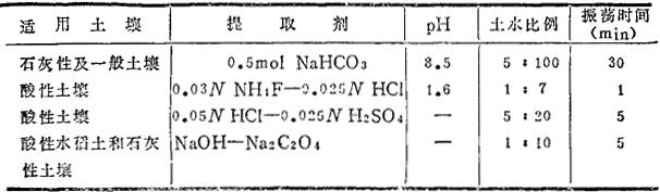 土壤中有效磷含量是指能为当季作物吸收的磷量,因此生物方法是最直接的也是最可靠的。目前用同位素32P稀释法测得的“A”值,也可作为标准方法。阴离子交换树脂法有类似植物吸收磷的作用,测出的结果也接近“A”值。但用得最普遍的则是化学方法。化学方法是用浸提剂提取土壤中一部分有效磷。数量上并不等于作物吸收的磷量但应有较好的相关性。浸提剂种类很多。目前我国常用的浸提剂为0.5molNaHCO3,0.05NHCl-0.025NH2SO4,0.03NNH4F-0.025NHCl,NaOH-Na2C2O4等,表10-2中列出四种常用的化学浸提方法。