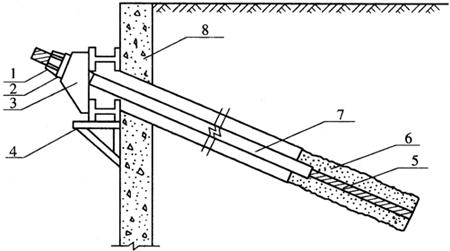 释义 | 土层锚杆的施工 土层锚杆也称为土锚,这是一种受拉杆件,它的一端锚固在稳定的地层中,另一端与支护结构的挡墙相连接,将支护结构和其他结构所承受的荷载(土压力、水压力等),通过拉杆传递到稳定土层中的锚固体上,再由锚固体将传来的荷载分散到周围稳定的地层中。 (一)锚杆支护体系构造和材料 1.锚杆支护体系构造 锚杆支护体系构造非常简单,主要由支护挡墙、腰梁及托架、锚杆三部分组成,如图10-17所示。腰梁的主要作用是将作用于支护挡墙上的水压力和土压力传递给锚杆,并使各锚杆的应力通过腰梁得到均匀分配。锚杆由锚头、拉杆(拉索)和锚固体三部分组成。 图10-17 锚杆支护体系构造示意图 1-锚具;2-垫板;3-台座;4-托架;5-拉杆;6-锚固体;7-套管;8-围护挡墙 2.锚杆支护体系材料 锚杆支护体系所用材料是否符合设计要求,是锚杆支护成功的关键,必须根据实际情况选用合适的材料。 土层锚杆是一种受拉杆件,在张拉时具有足够的弹性变形与强度,为了降低用钢量,大多宜采用高强度钢,我国目前常用的拉杆材料为钢绞线和粗钢筋。粗钢筋通常用直径22~32mm的变形钢筋,以增加钢筋与砂浆的握裹力。钢绞线近些年来应用较多,多为高强低松弛钢绞线。 锚杆灌浆所用的水泥宜选用普通硅酸盐水泥,强度等级不宜低于42.5MPa,但不宜采用矿渣硅酸盐水泥、火山灰质硅酸盐水泥,也不得采用高铝水泥。 细集料宜选用粒径小于2mm的中细砂,砂的含泥量不应超过3%,砂中所含云母、有机质、硫化物及硫酸盐等有害物质的含量,按重量计不应大于1%。搅拌用水不应含有影响水泥正常凝结硬化的有害杂质,不得用污水和海水拌制。 (二)土层锚杆的施工工艺 土层锚杆的施工包括锚杆的加工、钻孔、安放拉杆、灌浆、养护、张拉锚固和验收试验。在正式施工前还应做好研究设计文件、调查环境条件、编制施工组织设计、修建临时设施、检验所用材料和技术交底等施工准备工作。 1.钻孔机械的选择 锚杆钻机的类型很多,各种类型有不同的施工工艺特点和适用条件。按照工作原理不同,钻孔机械主要有回转式钻机、螺旋式钻机和旋转冲击式钻机三类。在选择钻孔机械时,应根据土质情况、钻孔深度和地下水情况等综合考虑。 (1)回转式钻机 回转式钻机钻头安装在套管的底端,是由钻机回转机构带动钻杆给孔底钻头以一定的钻速和压力,被钻头切削下来的土通过循环水形成泥浆水流排出孔外而成孔。根据土质的软硬程度不同,可以选用不同硬度的钻头。 回转式钻机适用于黏性土及砂性土地基。如在地下水位以下钻进,对土质松散的粉质黏土、粉细砂、砂卵石及软黏土等地层,应用套管保护孔壁,以免出现塌孔。 (2)螺旋式钻机 螺旋式钻机是利用回转的螺旋钻杆,在一定钻进速度和钻进压力下,在向土体钻进的同时,将切削下来的松动土体顺着螺旋叶片排出孔外。螺旋式钻机在钻进中不需要用循环水,不使用套管保护孔壁,因此辅助作业时间少,钻进速度比较快。 螺旋式钻机主要适用于无地下水条件下的黏土、粉质黏土及较密实的砂层中成孔。 (3)旋转冲击式钻机 旋转冲击式钻机的旋转、冲击、钻进、钻机装卸和移动,都是靠油压装置运行。这种钻机一般有三台油压泵,三个动作可以同时作用,在旋转中前端打击向前移动并打入套管。既可采用干作业法钻进,也可采用清水循环护壁套管钻进。 旋转冲击式钻机特别适用于砂砾石、卵石层及涌水地基,是一种适用于土锚工程、各种灌浆作业等多种钻孔用的机械。钻孔直径一般为80~130mm,并可钻任何角度的孔,根据土质情况可分别使用旋转或冲击,其能迅速装卸,钻孔速度快。我国所用的这类钻机主要是从日本和德国进口的。 2.钻孔方法的选择 钻孔方法的选择,主要取决于土质情况和采用的钻孔机械,在工程中常用的土层锚杆钻孔方法,主要有干作业钻进法和水作业钻进法两种。 (1)干作业钻进法 干作业钻进法一般是选用不护壁的螺旋钻机干作业成孔,成孔有两种施工方法: 一种方法是钻孔与安放钢拉杆分为两道工序,首先用螺旋钻孔进行钻孔,成孔后将钻杆退出孔洞,用空气压缩机风管冲洗孔穴,清除孔内残留的土屑,然后再插入钢拉杆,并进行压力灌浆锚固。 另一种方法是将钻孔与插入钢拉杆合为一道工序,即钻孔时将钢拉杆插入空心的螺旋钻杆内,随着钻孔的不断深入,钢拉杆与螺旋钻杆一同到达设计规定的深度,然后提出螺旋钻杆15~20cm,并开始进行压力灌浆,边灌浆边继续退出钻杆,而钢拉杆则被锚固在孔内。此方法灌浆时螺旋叶间充填的土可起到保护孔壁、防止塌滑和堵塞灌浆液外流、提高灌浆压力的作用。 干作业成孔法适用于黏土、粉质黏土、密实性和稳定性较好的砂土等地层,要求土层锚杆要处于地下水位以上、呈非浸水状态时使用。干作业成孔法具有施工操作方便、场地无积水、工作效率高、适宜于冬季作业等优点。 (2)水作业钻进法 水作业钻进法在土层锚杆施工中应用较多,一般选用回转式钻孔或旋转冲击式钻机成孔。钻进时冲洗液(压力水)从钻杆的中心流向孔底,在一定水头压力(约0.15~0.30MPa)下,水流携带着切削下来的土屑从钻杆与孔壁之间的孔隙处排出孔外。钻进时要不停顿地供水冲洗,始终保持孔口的水位。待钻至设计规定的深度后,继续用压力水冲洗残留在孔内的土屑,直至浑浊的水流变清时为止。 