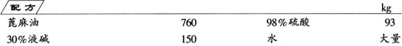 首先将蓖麻油装入磺化釜内(磺化釜可用陶瓷缸),然后在搅拌中缓缓加入浓硫酸,并使其温度控制在34~45℃,不超过50℃。夏季操作,需在磺化缸外部用水冷却,以保持磺化温度;冬季则需在加硫酸前先将蓖麻油加热至(30±2)℃,然后再在搅拌中加硫酸。硫酸加完后,持续搅拌2~3h,待磺化液呈浓厚泡沫状,可取数滴于小杯中,加水分散为透明液体时,即可进行洗酸。
