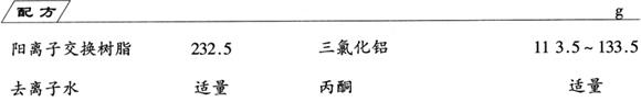 在三颈烧瓶中投入阳离子交换树脂,然后缓慢加入添加助剂的无水AlCl3的乙醇溶液,使得AlCl3加入量高出理论量的0.75~1.0倍。开动搅拌,控制反应温度到78℃(沸腾温度),反应10h。反应完后,自然冷却至室温。加入去离子水,搅拌,使多余的AlCl3水解,取出并过滤后用丙酮洗,再用去离子水洗至无Cl-,真空干燥,即为成品。分析Al3+含量(因为催化性能的好坏主要取决于络合上去的Al3+含量)。