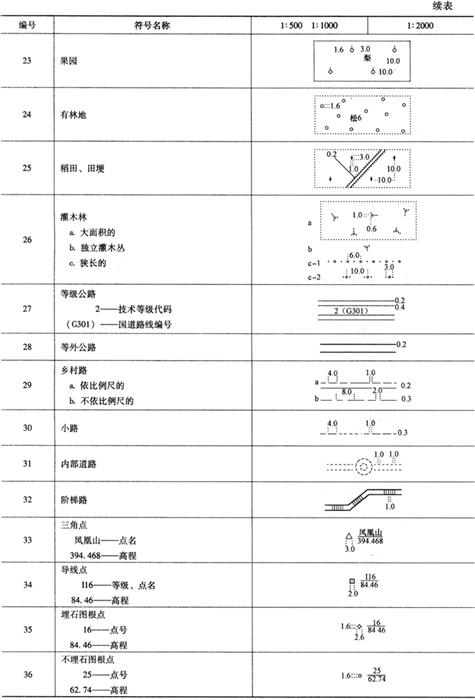地面上的地物与地貌,应按国家测绘总局颁发的《地形图图式》中规定的符号表示在图形中。图式中的符号分为地物符号、地貌符号和注记符号三种。其中地物符号分为比例符号、非比例符号、半比例符号和地物注记四种。