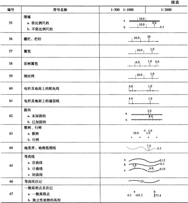 一些线状延伸的地物,如电力线、通讯线等,其长度能按比例尺缩绘,而宽度不能按比例表示的符号,称为半比例符号。表7-6为地形图图式中的一些常用符号。