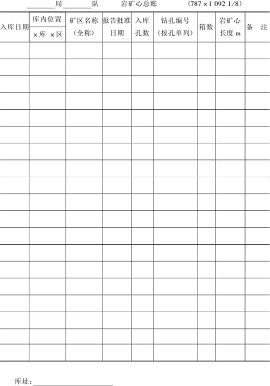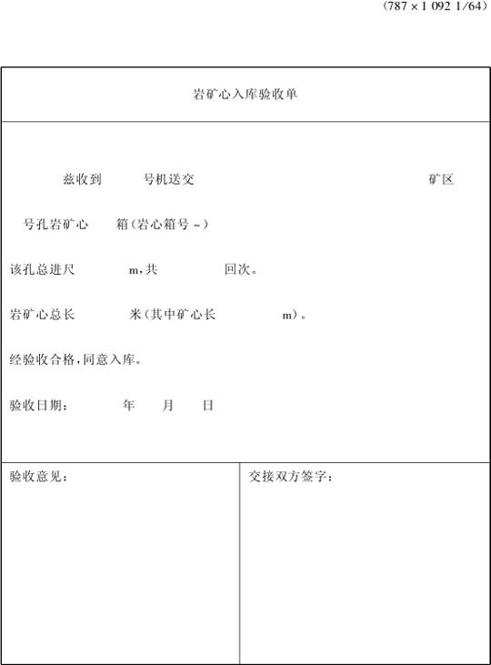 释义 | 地质勘查钻探岩矿心管理通则 1 主题内容与适用范围 岩矿心是地质勘查工作中的一项重要基础实物资料,是研究和评价地质矿产的重要依据。为妥善保护和保存岩矿心资料,根据《中华人民共和国矿产资源法》第二十四条规定,特制定本标准。 1.1 主题内容 本标准规定了地质勘查钻探岩矿心(含岩屑,下同)的现场管理、缩减处理、移交入库和库房管理。 1.2 适用范围 本标准适用于地质勘查行业钻探岩矿心的全程管理。 2 岩矿心的现场管理 2.1 钻前准备 2.1.1 平整机场时,机台要平出放置岩矿心的场地,并有防雨和遮阳设施。 2.1.2 开钻前,机台(井队)应将钻孔(井)地质编录所需的各种物资,包括岩矿心装具和用于岩矿心编号的书写工具、材料等准备好,没有足够的岩心箱不得开钻。 2.2 钻孔(井)取心 2.2.1 采取岩矿心应严格按照岩心钻探操作规程和项目地质设计的有关规定执行。 2.2.2 退取岩矿心,严禁吊打岩心管,避免岩矿心人为破碎或次序颠倒。对于松软岩矿心要尽量保持原状。 2.3 岩矿心整理 2.3.1 从岩心管取出的岩矿心应按其出筒的顺序摆放,随即进行清洗。岩屑要用清水漂洗,以露出岩石本色为准。不能水洗的岩矿心(盐类矿产和含油气岩心等)应揩去泥浆或除去泥皮。并清除假岩心和外来混杂物质。 2.3.2 将清理好的岩矿心按由浅至深的顺序从左到右、自上而下依次摆放在岩心箱(盒)内。 岩屑以及中心取样(center sample recovery)钻孔样品应先进行干燥处理,一般可采用自然晾晒的干燥方法,必要时采用可控温或低温烘干,禁止高温烘烤。经干燥处理后的岩屑,应连同标签一并装入岩屑袋内。CSR样品晾干后先行缩分,作为地质副样的一份装袋保留。从微型旋流器收集的柱状样品需要时可作为岩性实物剖面保存。 2.3.3 松散、破碎的岩矿心应按其所在位置分段装入袋内。易挥发、潮解和易于氧化的岩矿心要及时装入密闭容器保存。对油基泥浆取心和密闭取心井的油砂必须立即用无色玻璃纸或油纸包好用蜡密封,以便取得含油饱和度等有关资料。 2.3.4 岩矿心丈量要准确。丈量时应尽量将各自然断块对接好,对于松散、破碎的岩心不得随意拉长或压缩,必要时可采用体积法换算其长度。 2.3.5 所有岩矿心均需按回次(简次)统一编号。凡长度大于10cm的岩心(矿心为5 cm)直接在圆柱面上或横切面上编号;小于上述长度的岩矿心分段装袋后编号。 2.3.6 编号时,用红(白)漆或油浸色笔写明回次号(左侧)、本回次岩心总块数(分母)和该块岩心的序号(分子),如图1所示。其右端应为靠近孔底(或钻头)的一端。袋装岩矿心只在袋上标记,袋内放入标签。 图1 2.3.7 每个回次的岩矿心整理后应当即填写岩心牌(票),写明本回次取心数据,并置于本回次岩矿心的末端。岩心牌采用木牌,其外加套透明薄塑。岩心牌格式如图2所示。 图2 2.3.8 岩矿心编号标记和岩心牌填写必须书写工整,字迹清晰,数据准确。 2.4 岩矿心的现场保管 2.4.1 现场岩矿心均应装入岩心箱(盒)内,箱内岩矿心上下回次间应插放挡板(岩心牌),行与行之间应有岩心隔板隔开。岩心箱外侧标明矿区名称、孔号、箱号(以孔为单元按所装岩矿心自浅而深的顺序用阿拉伯数字连续编号)、起止回次号。若为岩屑或CSR样品还应标明孔深和袋数。 2.4.2 现场岩矿心应摆放整齐,岩心箱垛高不得超过1.5 m,钻孔验收后岩矿心应及时入库保管。 2.4.3 岩心箱(盒)必须质地坚固,便于搬运,规格符合附录A要求。 2.4.4 地质编录时要检查岩矿心编号和摆放情况,其上下次序是否颠倒,连接是否合理,并复核岩矿心长度。若发现问题,应立即向机(班)长提出,并及时纠正。 2.4.5 地质编录后应将岩矿心放回原处。若需采集标本应在记录本上注记,并填写取心票放入箱内相应位置。 2.4.6 凡因观察岩性或采样致使岩矿心断裂、编号破损的,应由当事人重新标记。 2.4.7 对钻孔岩矿心采取化学分析样品时,除个别特殊矿种,均应采用劈分法或切割法。劈分的一半作为岩矿心副样留存。岩屑正样保存,重量不少于200g。若因实验测试需要,必须采取全部矿心或整段岩心柱时应在项目地质设计中加以明确。 2.4.8 现场岩矿心由机台(井队)负责保管。除编录人员外,不允许其他人员在机台(井队)现场采样。 3 岩矿心移交入库 3.1 岩矿心入库 3.1.1 终孔后,岩矿心经现场验收,由机台(井队)负责派人护送到矿区岩心房或岩心分库暂存。 3.1.2 矿区勘查工作结束,岩矿心按规定缩减后,凡需长期或永久保存的应移交岩心总库保管。 3.1.3 若有条件时,各地质队应将各矿区需永久保存的岩矿心移送局级中心库或地区性岩心库。 3.1.4 岩矿心转运途中应有专人负责。岩心箱应加盖保护,以防运输过程中岩心箱翻倒,造成岩矿心散乱、污损、丢失。 3.1.5 岩矿心入库均需办理入库手续,填写入库验收单(附录D、F、G)。库管人员应对入库岩矿心进行认真检查,严格把关,验收合格后方可入库。 3.1.6 验收时应根据入库验收单对照实物资料逐箱核对,检验后在验收单上签署意见。验收单一式两份,交接双方各执一份,并存档备查。 3.1.7 凡验收不合格的,库管人员不予签字,待差错消除后再办理正式入库手续。 3.2 岩矿心移交 3.2.1 矿区勘查工作结束,分队应将需要长期保存的岩矿心移交大队岩心库保管。 3.2.2 勘探矿区的岩矿心,若矿山建设需要,可在勘探报告批准后,经双方协议和局级主管部门批准,
