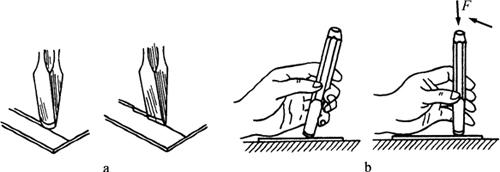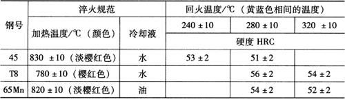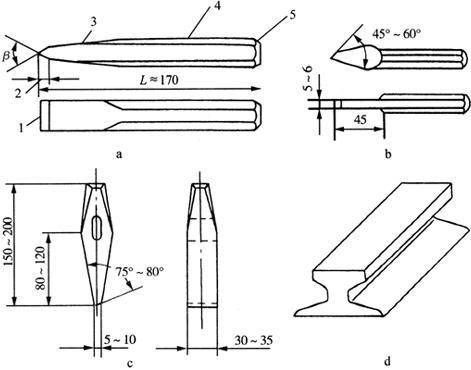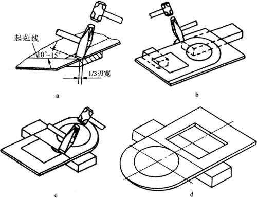 释义 | 型材切割 (一)锯切下料 锯切是通过锯齿的切割运动切断材料或锯出工件上的切口、沟槽等,是型材和管材常用的下料方法。其中,带锯、盘锯、摩擦锯和摆锯适用于有色金属的切割下料,而条锯可用于各种材料的管件的切割下料。 条锯锯条由碳素工具钢或合金工具钢制成,并经淬火和低温退火处理。最常用的手弓锯锯条约长300mm、宽12mm、厚0.8mm,锯齿按齿距P大小可分为粗齿(P=1.6mm)、中齿(P=1.2mm)、细齿(P=0.8mm)。 锯齿的粗细选用,应根据锯切材料的性质和厚薄进行选择。通常,粗齿锯条适用于较软的低碳钢、紫铜、铝、塑料等材料;中齿锯条适用于中等硬度钢、黄铜、厚壁管、型钢、铸铁等材料;细齿锯条适用于硬钢、金属薄板、薄壁管等材料。 (二)剋切下料 錾切是利用錾子或剋子刃口的切削运动对工件进行加工,主要用于切断材料、切除毛刺、切除余料、切出沟槽或坡口等,每次剋削的金属层厚度为0.5~2mm。 常用的錾子为扁錾和狭錾(图8-11a、b),常用的剋子分上剋子和下剋子(图8-11c、d),一般采用45、T8、65Mn等碳素工具钢和弹簧钢锻制成,并经刃磨与淬火加低温回火后(表8-3)方能使用。其中下剋子通常利用废剪刃片或钢轨加工而成。 表8-3 不同钢号錾子和剋子的热处理工艺及硬度 图8-11 剋切工具(单位:mm) a.扁錾 b.狭錾 c.上剋子 d.下剋子 1.切削刃 2.切削部分 3.斜面 4.柄 5.头部 剋切前,将板料放在铁砧或平板上,在板料的切缝下垫上软铁等辅助材料,视情况而定选用C形卡或压板等固定,并将选定剋子的切削刃磨成适当的弧形(图8-12a),以便使前后排剋时的剋痕连接光顺。当剋切直线段时,錾子切削刃可以宽些,而曲线剋切时,切削刃的宽度应根据其曲率半径大小确定,使剋痕能与曲线基本一致。 图8-12 剋切方法 a.剋断 b.操作要领 剋切时,錾子刃口必须先对齐剋切线并成一定斜度(图8-12b),按线由前向后排剋,然后逐步放垂直,依次剋切下料。 (三)剋切下料 1.直线剋切 要保持上剋子的合适倾角且与下剋子的靠紧,随时纠正剋切偏差。剋切前,将板料平放在下剋子上,余料部分探出剋刃,以过线找正,使剋切线与下剋刃重合,上剋刃对准切口线置于板料上,要探出1/3剋刃宽,并与下剋刃相靠,且保持上剋子的前面与板料垂直、刃口与板料成10°~15°的倾角(图8-13a)。 图8-13 錾子剋切方法 a.錾子位置及倾角 b.外曲线 c.内方孔 d.内圆孔 2.曲线剋切 由于上剋刃、下剋刃均为直线,其剋切的线也只能为直线段,所以沿曲线剋切的实质是围绕曲线剋切成一个外切多边形,每次剋切量越小,剋切出的直线段越短,越接近曲线。并且,板料转动越频繁,锤击越短促,越容易剋切出近似曲线(图8-13b)。 3.内方孔剋切 图8-13c所示为使剋切的开口准确,对准下剋刃划直线,并将上剋刃尖角倾斜10°~15°与板料接触,轻轻锤击开口,待剋切出2~3倍刃宽的长度时,再将上剋刃平放于起剋处清根切透即可。 4.内圆孔剋切 为便于起剋,首先应选好起剋点,一般选在便于扶持板料的位置,过起剋点作内圆的切线,以便对准下剋刃(图8-13d),剋切方法与图8-13b的外曲线一样,内曲线的圆滑度也应符合要求。 |
