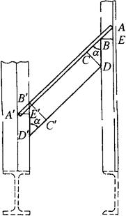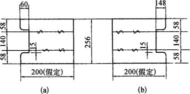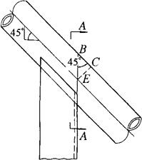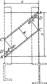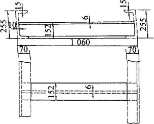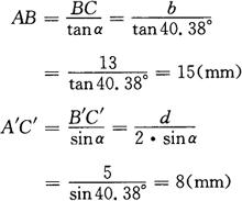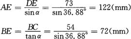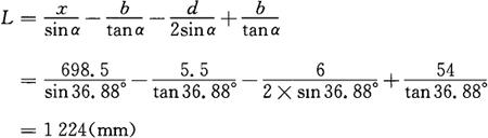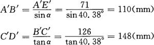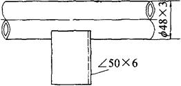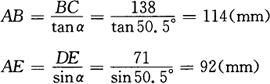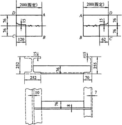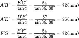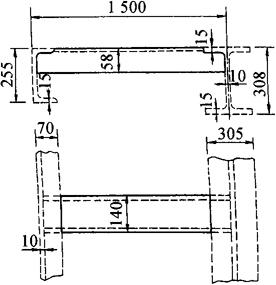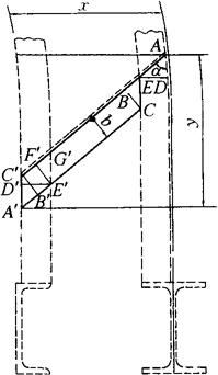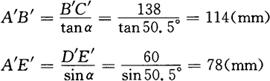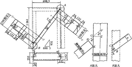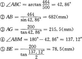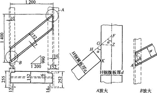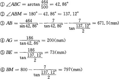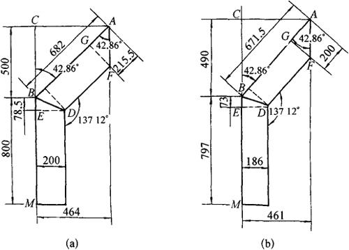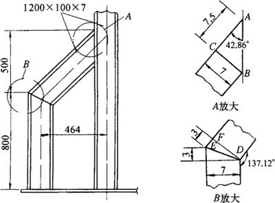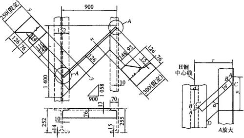 释义 | 型钢制件的计算展开 本段主要介绍柱钢结构的料计算。型钢的连接分垂直连接和倾斜连接两种方式,其关键是如何求得全长和结合部分的尺度,以便作出端头样板并准确下料。其他如桁架、屋架结构比较简单,此略。 另外还介绍了角钢立柱和管栏杆的料计算。 1.等边角钢与H钢、槽钢垂直拉撑料计算 如图3-159所示,左侧与H钢垂直连接,右侧与槽钢垂直连接,作端头样板的方法是: 图3-159 等边角钢与H钢、槽钢垂直拉撑施工图及展开图 ①作基础实形ABCD,使长×宽=200×152(mm2)。 ②在实形中作出76mm的中心线。 ③在端头划出15mm、120mm(H钢)和62mm(槽钢)的缺口线。 2.不等边角钢与H钢、槽钢斜拉撑料计算 如图3-160所示,左侧为不等边角钢与H钢倾斜连接,右侧与槽钢倾斜连接。下面分别叙述料计算和端头样板的作法。 图3-160 不等边角钢与H钢、槽钢斜拉撑施工图及展开图 (1)斜拉撑顶角 (2)拉撑全长 表达式推导如下(见图3-160之A放大和图3-161)。 图3-161 不等边角钢与H钢、槽钢斜拉撑计算原理图 在直角三角形ABC和A′B′C′中 在直角三角形A′E′B′和B′C′D′中 式中 x——跨度; y——斜拉撑垂直高; b——角钢板厚; d——H钢腹板厚; B1——不等边角钢大面宽。 (3)作样板方法(见图3-160) 用不等边角钢外沿的断面宽76mm、126mm共202mm作为宽,用假定的300mm(或250mm)作为长作基础实形,在其上截取长短点之差和含着部分长即为展开图。 3.H钢与槽钢垂直拉撑料计算 如图3-162所示,为H钢两端皆与槽钢垂直相连施工图,图3-163为H钢切头样板。 图3-162 H钢与槽钢垂直拉撑 图3-163 H钢(与槽钢相连)垂直拉撑切头样板 作切头样板的方法是:根据H钢规格的大小决定假设端头样板的长度,太长了会造成浪费,太短了导向范围小,本例取长度为200mm,其步骤是: ①作ABCD矩形框,使其长宽为200×213(mm),为基础实形。 ②在基础实形中作出间隔140mm(腹板内腔高)和73mm(翼板内腔宽)的平行线。 ③在端头再划出15mm和60mm缺口线。 ④作两个正反曲样板各划一端头,即得端头切割线(作一个样板正反使用亦可)。 4.槽钢与槽钢、H钢垂直拉撑料计算 如图3-164所示,左侧为槽钢与槽钢垂直相连,右侧为槽钢与H钢垂直相连施工图,图3-165为端头样板展开图。 图3-164 槽钢与槽钢、H钢垂直拉撑 ①拉撑全长L=1485mm。 ②槽钢与槽钢的切头样板[见图3-165(a)]。 图3-165 槽钢与槽钢、H钢垂直拉撑切实样板 (a)与槽钢切头样板;(b)与H钢切头样板 用槽钢断面之58mm、140mm和58mm共256mm作为宽,用假定的200mm作为长,划出基础实形并引出平行线,在平行线上分别去掉含着部分长60mm和翼板厚15mm,即得切头样板。 ③槽钢与H钢的切头样板[见图3-165(b)]。 同上法作出基础实形,在平行线上分别去掉含着部分长148mm和翼板厚15mm,即得切头样板。 5.槽钢与槽钢、H钢斜拉撑料计算 如图3-166所示,左侧为槽钢与槽钢斜接,右侧为槽钢与H钢斜接,现将计算方法和作样板方法叙述如下。 图3-166 槽钢与槽钢、H钢斜拉撑 (1)斜拉撑顶角 (2)斜拉撑全长 表达式推导如下(见图3-166之A、B放大) 在直角三角形GHK和FZG中 在直角三角形ABC中 (3)槽钢与槽钢切头样板(见图3-167左侧) 图3-167 槽钢与槽钢、H钢斜拉撑切头样板计算原理 在直角三角形A′B′C′和A′D′E′及E′F′G′中 (4)槽钢与H钢切头样板(见图3-167右侧) (5)作样板方法(见图3-166) 用槽钢的外沿断面宽54mm、152mm和54mm共260mm作为宽,并作平行线,用假定的250mm作为长划基础矩形,在其上分别截取以上计算各数据,即得切头样板。 以上各式中x为斜撑跨距;y为斜撑投影高;a、b分别为槽钢腰厚和翼板宽;d为H钢腹板厚。 6.H钢与槽钢、H钢斜拉撑料计算 如图3-168所示,左侧为H钢与槽钢倾斜连接,右侧为H钢与H钢倾斜连接,现将计算方法和作样板方法叙述如下。 图3-168 H钢与槽钢、H钢斜拉撑 (1)斜拉撑顶角 (2)斜拉撑全长 表达式推导如下(见图3-168之A、B放大) 在直角三角形GHK和FZG及ABC中 (3)H钢与槽钢切头样板(见图3-169左侧) 图3-169 H钢与槽钢、H钢斜拉撑切头样板计算原理 在直角三角形A′B′C′和A′D′E″中 (4)H钢与H钢切头样板(见图3-169右侧) 在直角三角形ABC和ADE中 其中 x——斜拉撑跨度; y——斜拉撑投影高; a——H钢翼板厚; d——H钢腹板厚; h——槽钢大面内腔高。 (5)作切头样板方法 H钢与槽钢切头样板见图3-170,H钢与H钢切头样板见图3-171。 图3-170 H钢与槽钢斜拉撑切头样板(反曲) 图3-171 H钢与H钢斜拉撑切头样板(反曲) 用H钢内腔的断面宽73mm、138mm和73mm共284mm为宽,用假定的250mm为长作基础矩形,并作平行线,在其上截取以上计算各数据,即得切头样板。 7.工字钢加强柱料计算 如图3-172所示,为圆筒式加热炉加强柱施工图,周向共4根。其下料方法有两种,一是按外皮切断,二是按里皮切断。但要注意,按外皮切断下料时,必须按结合线方向切割,以保证均匀的组对间隙。 图3-172 加热炉加强柱施工图 图3-173为计算原理图,图3-174为展开图。 图3-173 计算原理图 (a)按外皮;(b)按里皮 (1)按外皮切断计算[见图3-173(a)] 在直角三角形ACB中 (2)按里皮切断计算[见图3-172和图3-173(b)] 在直角三角形ABC中 图3-174 加强柱展开图 (a)按外皮;(b)按里皮 8.角钢立柱与管栏杆料计算 管与角钢组焊的栏杆,有直交式和倾斜式两种,此结构的主要关键是作角钢的展开样板,可用放样法或计算法作出,本文以计算法叙述之。 (1)直交式栏杆 图3-175所示为直交式栏杆施工图,由于管体与角钢的规