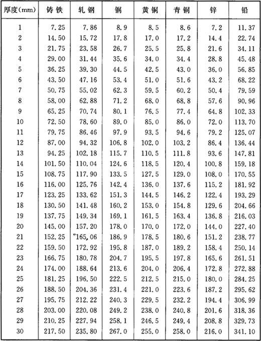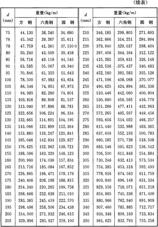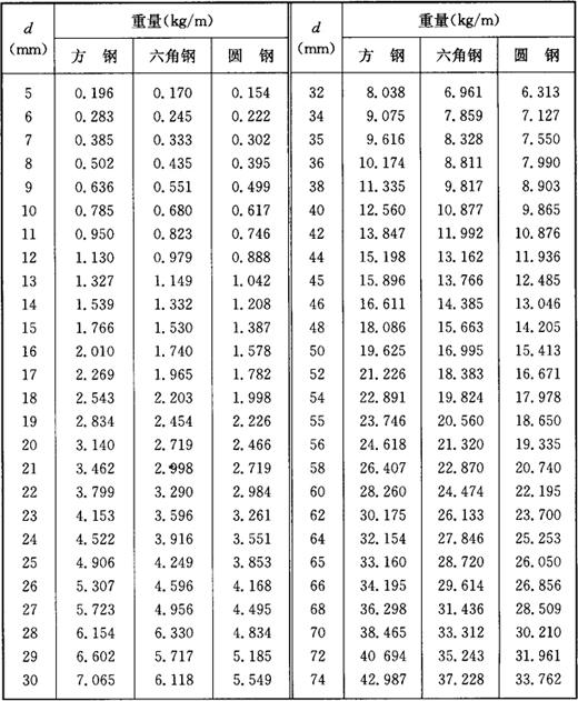 释义 | 型钢及金属板料的重量 1.方钢、六角钢及圆钢的重量 方钢、六角钢及圆钢的重量见表1-21。 表1-21 方钢、六角钢及圆钢的重量 注:1m3钢铁重7850kg。方钢及六角钢的d系指内切圆直径。 2.金属板料的重量 金属板料的重量见表1-22。 表1-22 金属板料的重量(kg/m2) |