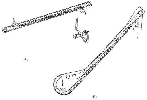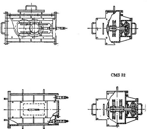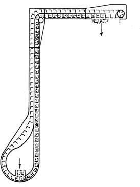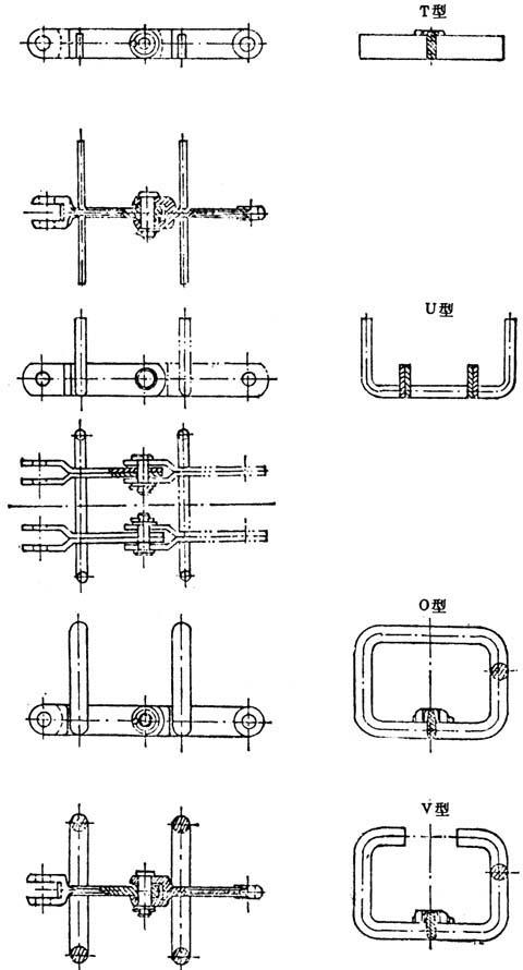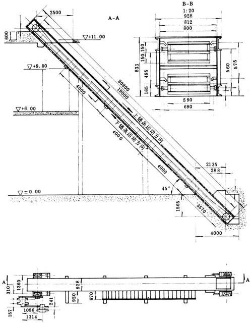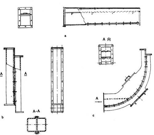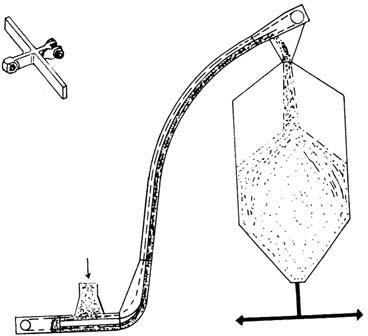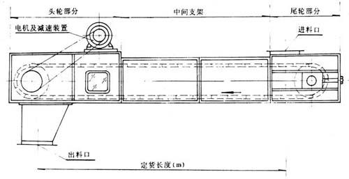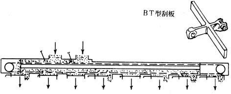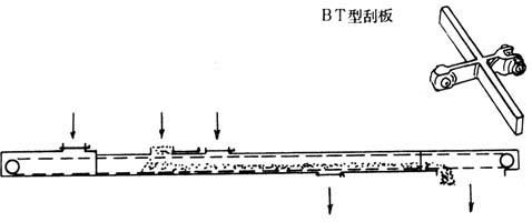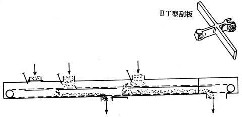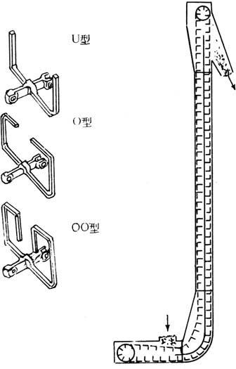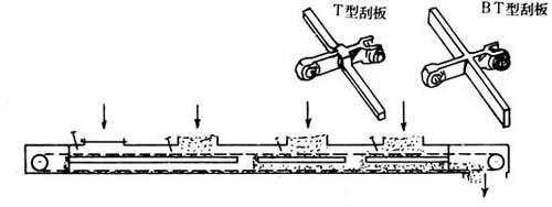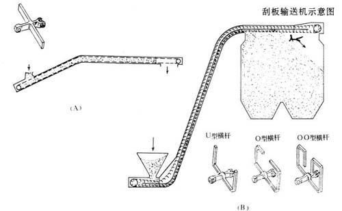 释义 | 埋刮板式运输机 埋刮板运输机是一种在封闭的矩形断面的壳体内,借助于刮板链条的连续运转输送物料的运输设备。 所谓埋刮板输送是指刮板链条埋在物料之中进行运输。 1.输送原理 ①在水平输送时,物料受刮板链条的运动方向的压力和自身重量的作用,物料向产生内摩擦力。保证了料层间的稳定状态,并能克服物料在槽中移动而产生的外摩擦阻力,形成连续正体的物料流面输送。 ②在垂直提升时,物料刮板链条运动的挤压力产生横向侧压力,形成物料的内摩擦力。同时,由于水平段的不断给料,下部物料不断对上部物料产生推移力。这种内摩擦力与推移力能克服物料移动产生的外摩擦阻力和物料自重,而形成连续的料流被提升。 2.主要构件 埋刮板运输主要由机头、料槽、刮板、链条、机尾、张紧与传动机构组成。 刮板宽B为200~1000mm。 刮板高h通常等于0.25~0.5B。 刮板间距应为链条间距的3~6倍。 (1)机头 刮板输送的牵引部分。由钢板焊制矩形断面壳体,装有八齿驱动链轮与链条齿合,壳体底部开有卸料口。 (2)料槽 可由若干料槽段组成。由料槽与机头、机尾外壳连成一个密封的刮板输送的壳体。每段料槽用4.5mm厚的A3钢板焊成,两端设有连接法兰。 ①水平段料槽:槽的断面为长方形,分上下两部分,上部为回行部分,下部为输送工作部。上下之间设有一条或两条用扁钢制成的轨道,供刮板链条输送,回行,滑动用。 ②垂直段料槽:槽内用钢板将输送工作部分与回行部分隔开,防止运输物料从运输工作部落入回行部分。 为防止安装错位,每段料槽端部设计成梯形接口。 ③弯曲段料槽:兼有水平与垂直料槽的特点,弯曲部分,上部放观察孔,下部设观察或检修卸料口。 ④料槽加料口:应设在水平段适当处,易流动的粉末和小颗粒的物料直接通过回行链条而到达工作部槽内;对块状或片状细碎原料可采用侧面装入工作部槽内。 (3)刮板链条 由不同型式的刮板与链条焊接而成。无端刮板链条是承载牵引的主要构件,刮板可采用单一型式,也可采用二种型式交错进行。 刮板链条形式: DT型——采用扁钢制成。 DV型和DO型——采用圆钢制成。 DT型、DV型和DO型结构简单,适合运输小块和粘性大的物件。 BV型——采用圆钢制造,适合运送悬浮性和流动性大的物料。 图6-2-60 料槽 a-水平段 b-垂直段 c-弯曲段 图6-2-61 侧面装料板 刮板链条的材料与安装: 刮板与链条应用45号调质钢材,载荷大应选用45Mn2调质钢材。 链条连接孔与销钉的配合,应选用D6/d6配合,以保证链条运动的灵活和平行、平稳。 (4)机尾与张紧装置 机尾壳件截面也是矩形,是用4.5mm厚薄钢板焊成。 尾轮无齿而带沟,设在壳内,由铸钢或墨铸铁制成。尾轮数与链条数相适应。尾轮轴两端装有双列向心球面轴承,安装在有梯形螺杆的可移动轴承座上,和机架螺母构成刮板链条的张紧装置。 3.埋刮板输送机的种类 (1)水平型刮板输送机 图6-2-62 刮板链条形式 ①单一式水平型埋刮板输送机:这种埋刮板输送机有几个进料口和出料口,一般输送单一物料,也可以几种物料混合输送,输送能力可达1000t/h,输送距离可达167m。 ②分开式水平型埋刮板输送机:这种埋刮板输送机有几个进料口和出料口,它可以分开输送几种物料,也可以将几种物料混合输送或输送单一物料。 图6-2-63 刮板运输机头部 图6-2-64 刮板运输机尾部 图6-2-65 单一式水平型埋刮板输送机示意图 ③混合式水平型埋刮板输送机:这种埋刮板输送机可以将若干种物料按比例混合输送,当然也可输送单一物料。 ④多出料口式水平型埋刮板输送机:这种埋刮板输送机的出料口特多,每个出料口都有滑动门,可以任意开启或开闭。 以上几种水平型埋刮板输送机的刮板型式均为BT型或T型。 (2)垂直型埋刮板输送机 它的刮板型式有U型,O型和OO型等三种。 这种垂直型埋刮板输送机,它的进料口在机脚水平段上,它可以代替斗式提升机,比斗式提升机优越之处是:钢材用量少,占地面积少,物料损失少和污染少。 图6-2-66 分开式水平型埋刮板输送机示意图 图6-2-67 混合式水平型埋刮板输送机示意图 图6-2-68 多出料口式水平型埋刮板输送机示意图 (3)倾斜型埋刮板输送机 倾斜型埋刮板输送机(A)的刮板型式为U型。 倾斜型埋刮板输送机(B)的机脚呈环状,可以节省水平段的空间,它的刮板型式与垂直型埋刮板输送机的相同。 (4)垂直水平综合型埋刮板输送机 图6-2-69 垂直型埋刮板输送机示意图 图6-2-70 倾斜型埋刮板输送机示意图 这种埋刮板输送机适用在狭窄的工作环境中将物料输送到料仓,它可以直接从卡车或铁路货车中将物料倒入设在环状机脚的进料口中。 这种埋刮板输送机的刮板型式与垂直型埋刮板输送机相同。 (5)倾斜水平综合型埋刮板输送机 这种埋刮板输送机可以直接从卡车或铁路货车将物料卸到进料斗,将物料输送到料仓。 上述倾斜水平综合型埋刮板输送机(A)的刮板型式为BT型,(B)的刮板型式有U型、O型和OO型三种。 (6)弧形埋刮板输送机 这种埋刮板输送机非常轻巧,不需要很多支承结构,主要运送质轻,易于活动的物料。 4.埋刮板输送机的优点 ①由于封闭性强,工作条件达到高度的卫生标准,极少尘埃飞扬。 ②结构简单、重量轻、体积小、制造容易,维修方便,刮板链子不必润滑。 ③安装简单,特别是在高空作业安装中,由于机体本身重量轻,是箱形断面,刚性好,只要简单的支承,节省