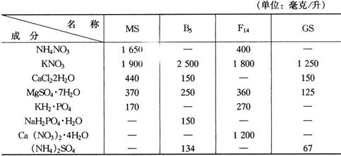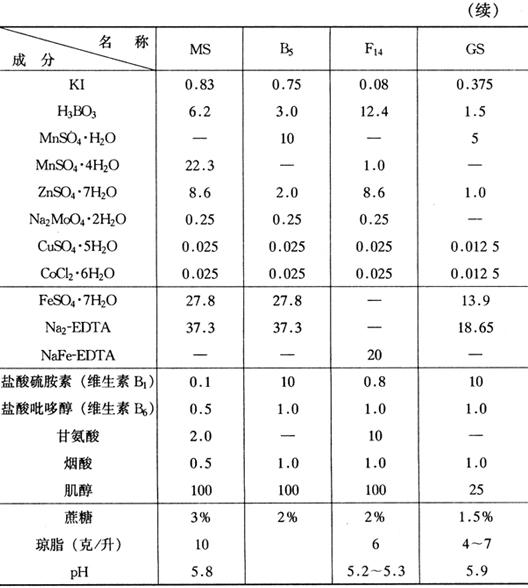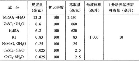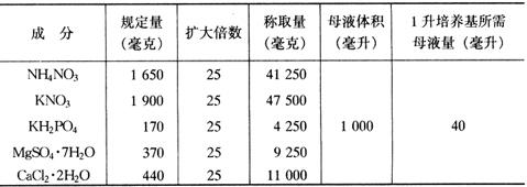 释义 | 培养基的制备 培养基是外植体生长的营养物质,是植物组织培养成功与否的关键因素之一(表2-1)。培养基的种类、成分直接影响到培养材料的生长,应根据外植体的种类和部位,选择适宜的培养基。培养基的成分主要包括:无机营养成分(包括大量元素和微量元素),有机营养成分(包括氨基酸、维生素和糖),植物生长调节剂(包括生长素、细胞分裂素、赤霉素等),其他有机附加物(包括一些成分尚不完全清楚的天然提取物,如椰乳、香蕉汁、番茄汁、酸母提取物、马铃薯浸汁等),在固体培养基中还需加入琼脂作为凝固剂。 表2-1 常用培养基成分表 1.器皿和用具的准备 配制培养所用的主要器具有不同型号的三角烧瓶(锥形瓶)、试管、烧杯、培养皿、容量瓶、移液管、滴管、玻璃棒、漏斗、注射器等。各种器皿、用具必须清洗干净后方可使用。新购置的玻璃器皿使用前选用1%稀盐酸浸泡一夜,然后用洗涤剂洗净,清水冲洗干净,最后用蒸馏水冲一遍,干后备用。已用过的器皿应先将残渣去掉,用清水洗净,然后再用洗涤剂洗净,清水冲洗干净,干后备用。移液管、滴管、容量瓶等由于口小不便碱洗,常用酸洗,即用酸液(40克工业用重铬酸钾经少量水溶解,然后缓慢加入粗制浓硫酸至1000毫升)浸泡一天后,取出在流水中冲洗干净后,再用蒸馏水冲一遍,干后备用。 2.母液的配制与保存 配制培养基用的水原则上应用纯水,一般用蒸馏水即可,化学药品用分析纯或化学纯,称量须准确,且应准确记录,以便日后查对。对于常用的培养基,一般先配成10倍或100倍的混合母液,贮存于冰箱内,用时再按比例稀释混合。这样使用方便,也减少工作量。通常大量无机盐类原则上可以混在一起,配成10倍浓度的母液,各种药品必须各自充分溶解后才能混合,混合时要注意先后次序,要把钙离子(Ca2+)、锰离子(Mn2+)、钡离子(Ba2+)和硫酸根(SO42-)、磷酸根(PO43-)错开,以免形成硫酸钙、硫酸钡、磷酸钙或磷酸锰沉淀。铁盐也容易发生沉淀,需要单独配制。一般用硫酸亚铁(FeSO4·7H2O)和乙二胺四乙酸二钠(Na2-EDTA)配成200倍浓度的铁螯合剂,比较稳定,不易沉淀。微量元素和维生素之类可配成100倍浓度的混合母液。各种母液配好之后,于冰箱内贮存备用。现以MS培养基为例,具体讲述母液的配制方法。 (1)大量元素母液 参照表2-2,按次序进行称量、溶解、配制。配好的母液贴上标签注明母液名称,扩大倍数、日期、及配制1升培养基时应取的量。于2~4℃冰箱内贮存,最好于1个月内用完。如发现有霉菌和沉淀产生,则不能再使用。 表2-2 MS培养基大量元素母液配制法 (2)微量元素母液 微量元素用量小,为称量方便及精确起见,可配成100倍母液。参照表2-3顺序称量,分别溶解后,依顺序混合,并定容于1000毫升的容量瓶中。 表2-3 MS培养基微量元素母液配制法 (3)铁盐母液 称量乙二胺四乙酸二钠7.45克加入蒸馏水900毫升于100℃水浴中充分溶解,称量5.57克硫酸亚铁(FeSO4·4H2O),逐渐倒入溶解后,使溶液冷却至室温,然后定容于1000毫升容量瓶中,置于棕色试剂瓶中保存。每配1升培养基加这样的铁盐母液5毫升。 (4)有机物母液的配制 氨基酸及维生素类物质分别用容量瓶配制成100倍的母液,在配制培养基时,每配1升培养基取10毫升母液即可。参见表2-4。 表2-4 MS培养基有机物母液配制法 (5)植物生长调节物质的配制 为使操作方便,生长调节物质也可如同配制母液一样,先配制成原液,这样配制培养基时只需稍加计算按需量取即可。原液于冰箱内保存。由于激素比较难溶解于水,所以就其溶解方法叙述如下: ①NAA(萘乙酸) 于温水中缓慢溶解。在丙酮和酒精中也能充分溶解。只用水溶解时,以50℃的水浴锅加温,并用磁力搅拌器搅拌,促其溶解。另外,NAA钠盐和钾盐,都易溶于水,使用方便。因NAA与NAA钾盐和钠盐的分子量不同,使用时需进行相应的换算。 ②2,4-D(2,4-二氯苯氧乙酸) 极难溶于水。可先以少量95%酒精溶解后再徐徐加水。2,4-D粉末析出时,再同样添加酒精溶解,然后再加水。这样反复进行操作,最终得到所需的溶液。 ③IAA(吲哚乙酸) IAA极微量溶于水。用与2,4-D同样的方法溶解。 ④BA(6-苄基腺嘌呤) 极微量溶解于水,在酒精和丙酮中则不溶。可用与NAA同样方法使用温水,以磁力搅拌器边搅拌边经过一定时间缓慢溶解,或者先以1摩研盐酸溶解后,再缓慢加入温水。 ⑤GA3(赤霉素) 微量溶于水,极易溶于丙酮或酒精中,可用溶解2,4-D的方法配制溶液。 激动素:溶液性能及溶液配制方法同BA。 3.培养基配制程序 ①称出规定数量的琼脂和蔗糖,加入蒸馏水至终体积的3/4,加热使之充分溶解。 ②另取一容器,分别按规定量加入各种母液,包括生长调节物质及其他特殊附加物。如不能高压灭菌的物质,应在调节了pH之后,使用0.22~0.45微米的微孔滤器消毒。 ③将②溶液倒入溶好的琼脂中,不断搅拌使其混合均匀。加入蒸馏水至培养基的终体积。 ④用0.1摩/升NaOH和0.1摩/升HCl调节培养基的pH。 ⑤用分液漏斗或分装器分装于事先准备好的试管或三角瓶等容器内。 ⑥用封口膜、包在纱布中的棉塞或其他适宜的塞或盖封严瓶,准备灭菌。 ⑦使用高压蒸汽灭菌锅于120℃(1.06千克/厘米2)下灭菌15分钟。 ⑧灭菌后及时取出培养基置于平面上,使其在室温下冷却。当使用试管制备固体培养基时,应在冷却期间将试管斜置,把培养基作成斜面。 |