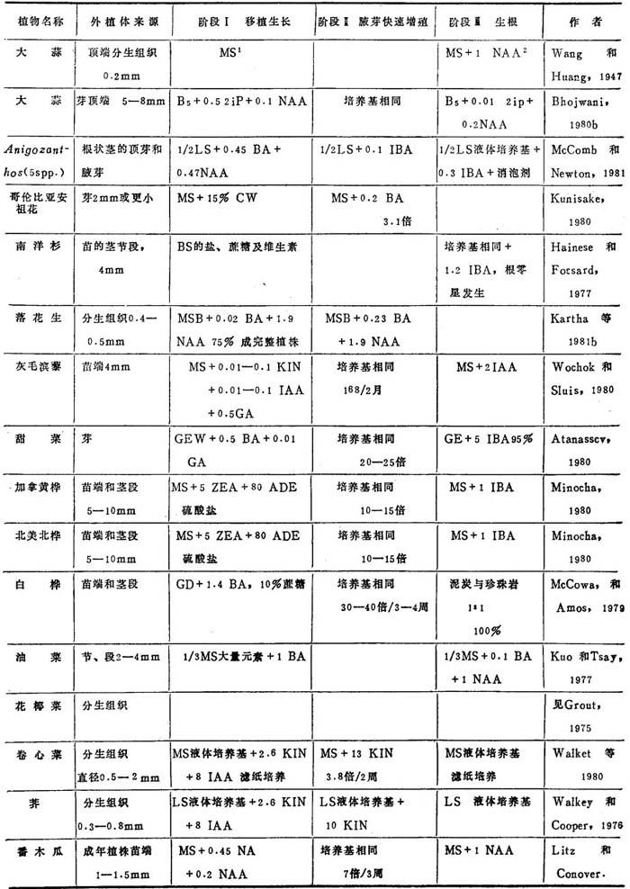 a.A=Anderson,1975;B5=Gamborg等,1968;BS=广泛培养基,Defossard,1974a;D=Dudits等,1975; GD=Gresshof和Doy,1972;GEW=Gamborg和Eveleigh,1978;HB=Harthey和Borker,1980;IS=Linsmajer和Skoog,1965;M=Miller,1963;MS=Murashing和Skoog,1962;MSB=MS盐+B5维生素;MSN=MS盐+NN维生素;MSW=MS盐+W维生素;MT=Murashige和Tucker,1969;NN=Nitsch和Nitsch,1969;QL=见Nemeth,1981引用;W=Walkey,1972;WH=White,1963;WPM=森林植物培养基(Lloya和McCown,1980). b.除指明的以外,培养基组成成份的浓度单位是mg/l。 c.AC=活性炭;NB=营养流体培养基;PG=间苯三酚。 尽管在一个培养基中较低的盐浓度有利于生根,但有时导致一个不良的顶端生长。Wang(1978)观察到1/9MS浓度的培养基促使100%的日本柳杉生根,但枝条生长不良,而另一方面1/3MS浓度的培养基能够使87%的发根,顶端生长良好。尽管Gupta等人(1981)将柠檬桉枝条从MS培养基移植到WH培养基上使枝条生了根,但是生根的枝条未能在这种低盐浓度的培养基上存活,叶子变黄脱落;如果在两周内即第一批根出现后将植物体移回到MS液体培养基中,黄叶转绿并形成一个良好的根系。 从表4一1可以看出,当第三阶段培养基的盐浓度降低时,表4-1所列的植物能成功地生根。 (4)支撑材料 在第三阶段大约9/10的培养基用琼脂作支撑物,它能够使培养基变硬,从而支撑根的生长。在生理学上,琼脂不是一种完全惰性材料,它是由多种可能对生长有影响的物质所组成的,这样在某些敏感的植物中,琼脂也许导致根生长不良。Lane(1979b)报道,当用0.6%的琼脂时,绣线菊和李的生根受到抑制。Kitto和Young(1981)探讨了Carrize citrange培养中琼脂浓度和生根能力成负相关,除了可能出现生长抑制物质外,另一个原因可能是培养基透气不良,生长组织所释放的有毒物质未能迅速扩散。通常采用下述两种方法防止琼脂培养基的抑制效应:(a)在琼脂培养基中加优质的活性炭(AC粉),(b)液体培养基和滤纸桥系统。 活性炭在培养中能吸附有毒物质,借此促使根再生和发育,活性炭也能吸附来自第二阶段培养基的外源细胞分裂素。Takayama和Misawa(1980)报道BA抑制百合根的形成和生长,加入活性炭能够完全消除这个抑制效应,无BA的含活性炭培养基优于不含活性炭的培养基。活性炭在离体培养中对根系具有遮光作用,而强光能抑制根的生长。 液体培养基在表4-1所列的第三阶段培养基中大致占12%,它有利于有毒物质的自由扩散,当液体培养基与滤纸桥系统一并使用时,对根的生长发育提供了良好的通气条件,它的缺点是很多实验室需要准备这种“桥”很费事,除非经实验证明琼脂加活性炭培养基的效果不满意外,一般不推荐使用这种培养法。 在第三阶段培养基中利用聚氨酯泡沫塑料(橡胶)和蛭石代替高价的琼脂已经获得了满意的效果。用蛭石作衬底来支持和透气的液体培养基,在西瓜培养中获得了比培养在0.4—1.2%琼脂培养基中的根系有更好的分枝和较大范围的根毛区。此外,就对根系的损伤而言,从蛭石中移出的植物体比从琼脂移出的植物体的根损伤要轻。 2.幼龄 对于那些难以生根的植物,特别是森林树种,植物的年龄在根的再生能力上起着有效的作用。de Fossard等(1974)观察到当外植体取自于幼苗的基部培养时,巨桉根的发育最常见,从子叶着生处到顶端的36个芽发根率分别为21、21、11、6和0。Wang和Hu利用5年树龄的美洲擦木树芽培养,所获得枝条进行实验,结果发现部分生根,而来自同种植物胚外植体所获的新枝的发根率为100%。在柠檬桉微型繁殖中Gupta等人(1981)报道了与幼苗的芽外植体生根需要5.0μM生长素相比,20年树龄的芽外植体生根需要10.0μM生长素。 已知继代培养过程能够改变外植体生理状态和逐渐重现外植体幼年阶段特性。来自成年葡萄无性系的离体芽经2—3次继代培养诱导出幼年阶段的某些特征特性。Gupta等(1981)以一百年树龄的柚木为材料进行芽培养,生根率为10%,第二次及连续的继代培养后,其生根率提高到60%;而种苗外植体的生根率,总是在80%以上。20年树龄的柠檬桉的芽培养。Gupta等人(1981)报道,开始和第1一3次继代培养的外植体在第三阶段处理中没有一个能生根,然而在第四次继代培养后的外植体有35—40%的枝条生了根,第五次和连续的继代培养它的生根率大约为45—50%。这些报道清楚地表明,连续的继代培养可以更新成熟植物组织的生理发育阶段,使幼年阶段的某些特性得以重现。所以随着继代培养的继续进行,根的诱导逐渐变得越来越容易。 3.培养条件在上述几个阶段里,很少有实验揭示培养条件对生根的影响。一般而言,强光照有助于生长良好的植株形成,提高光强很大程度促进生长,而且所产生的植株能够成功地转移到盆钵中。由于强光照对根的生长有抑制作用,所以要特别小心强光照不能直接照射在根上。用铝箔将培养容器遮蔽起来,或者在培养基中加0.3%的活性炭能促进根的生长。这个时期的光照强度一般采用0.54到10klx的范围。 在开始的几个阶段大多数研究者采用恒温培养。Schnabdrauch和Sink(1979)报道在最初的再生苗转移到22℃,进行根的伸长之前,将它置于30℃环境条件下一周,能够加速天兰绣球变种茎尖再生苗的生根。 (四)试管苗移栽 试管中再生的繁殖苗生根后,将从无菌的容器中移植到盆钵里,移栽过程中应该考虑感染和失水等因素。无菌的混合土壤能避免严重的感染问题,为了达到微型增殖的目的,失水是最大的障碍,所以应予解决。据记载,移植后的植株叶子立即过度地