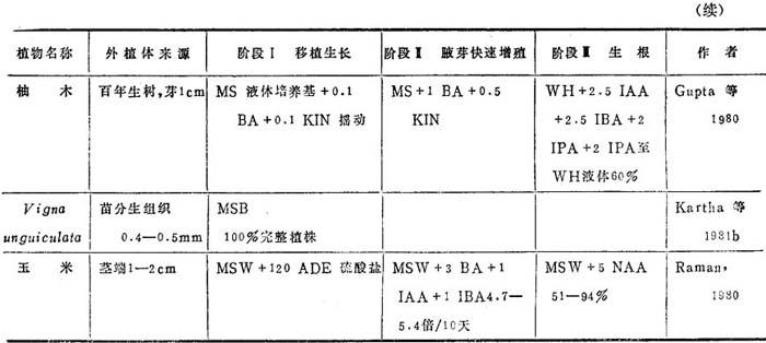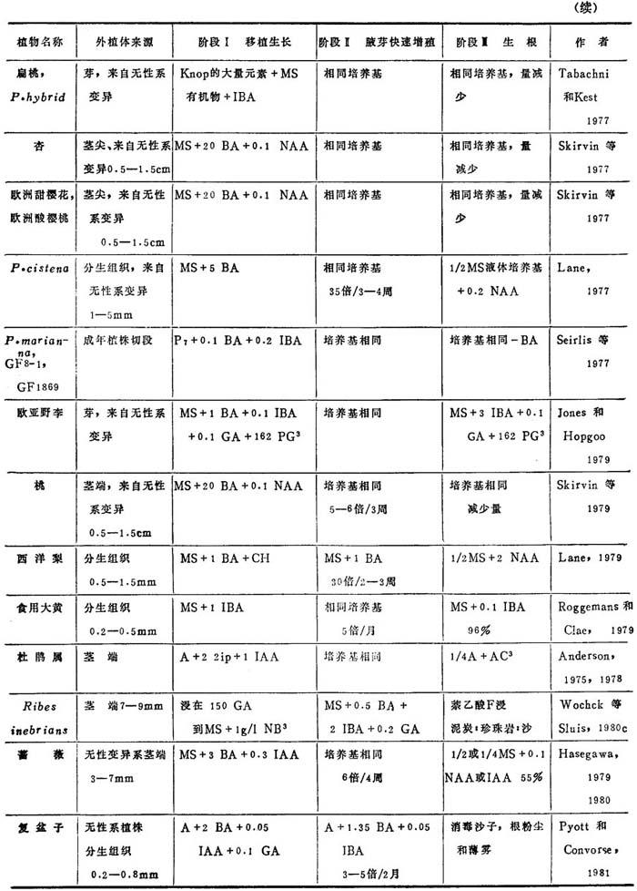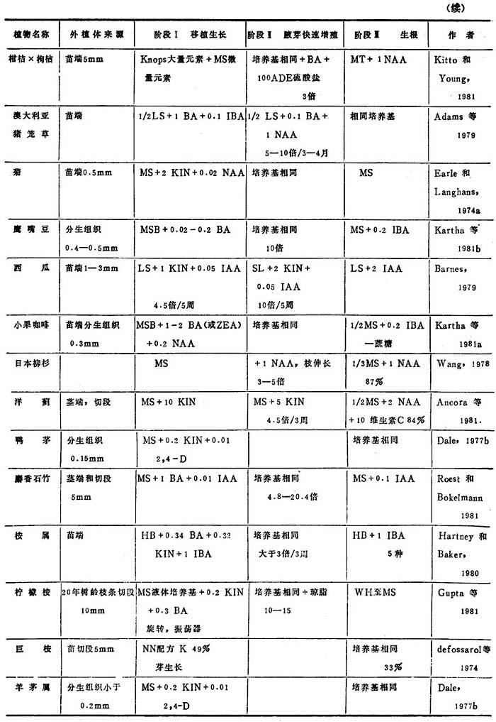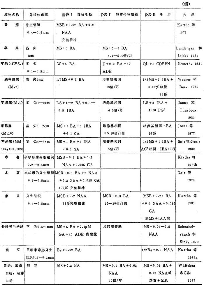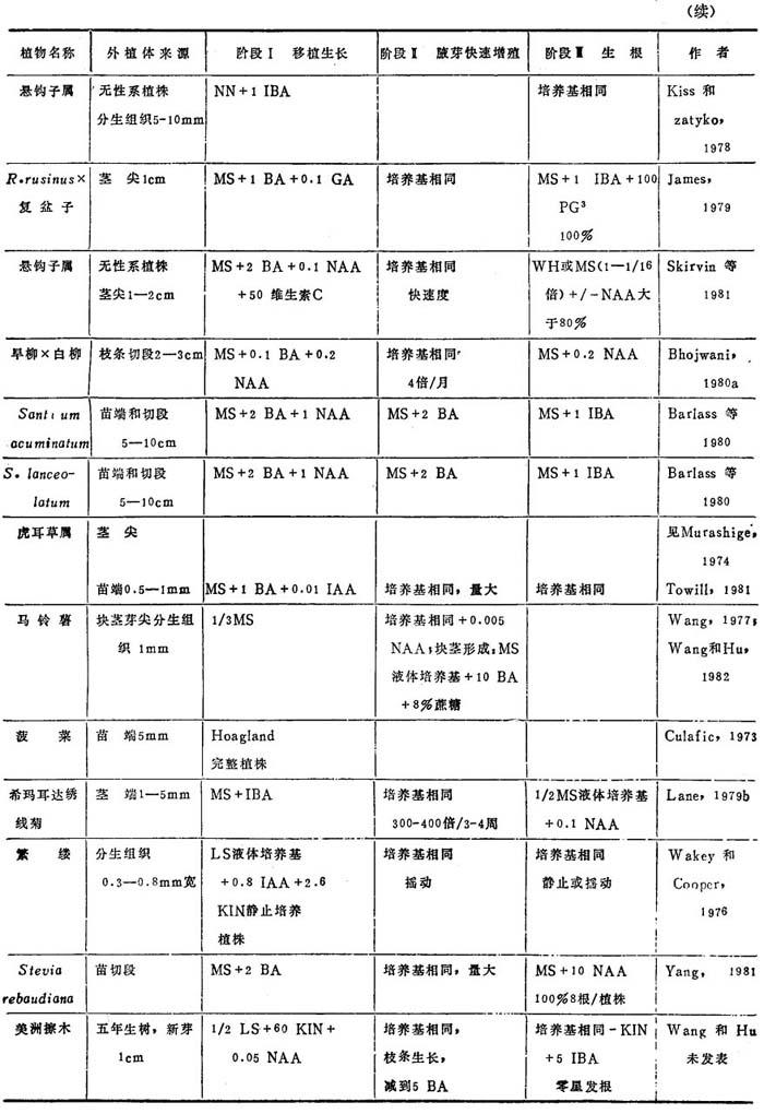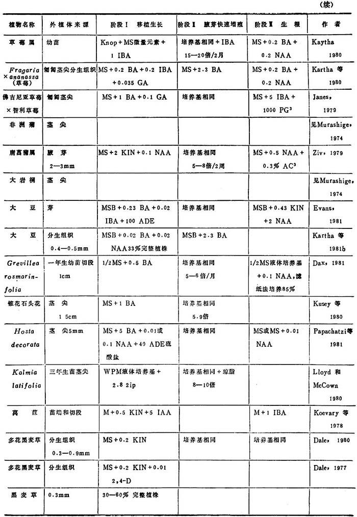 释义 | 培养阶段基本要点 (一)第一阶段:培养物的建立 在第一阶段外植体可能发育成单一的枝条,也可能发育成丛生枝条,甚至发育成有根的植株。属一、二两种情况,我们用微型嫁接。然而无病毒植株再生通常更乐意通过第三种情况——一步再生植株的分生组织培养。 1.生长调节剂 尽管在试管中所培养的植株能合成少量的细胞分裂素,根仍然是细胞分裂素合成的主要部位。分生组织、茎尖和芽外植体没有足够的内源细胞分裂素维持它的生长发育,所以,表4-l所列的第一阶段培养基有85%供给细胞分裂素,通常用三种细胞分裂素:KIN、BA和2iP,BA对分生组织、茎尖和芽的培养最有效,第二为KIN,2iP很少用,它们使用的频率影响到有效程度。在表4-l中,含有细胞分裂素的第一阶段培养基中有68%的用BA,23%的用KIN,9%的用2iP、ZEA和SD8339,后三种细胞分裂素使用的百分率低,片面地归之于价格高和使用价值有限。我们应该知道,尽管某种细胞分裂素对某些植物影响不大,但对另外一些植物往往效果显着,例如,杜鹃花科植物方面,2iP是作为被选用的细胞分裂素。表4-1所列的第一阶段培养基中有15%的不含细胞分裂素,这可能是外植体体中存在足够量的内源激素。此外,一些植物在这些情况下也能偶然再生根系,例如草莓属、菜豆属、悬钩子属和茄属。这些再生根在剩余的激素耗尽之后,能够作为一种新的细胞分裂素的来源。然而在第一阶段的15%,在不含细胞分裂素的培养基中,没有一个能促使腋芽增殖。 生长素是新枝生长所需要的另一种激素,因为幼嫩枝条顶端是生长素合成的活跃区域,在第一阶段培养基中并非总需要外源生长素,特别从一个生长着的植物体上切取一个较大的茎尖时,所以在表4-1中所列第一阶段培养基中有40%是无生长素的。在有些情况下,外源生长素并非必要,但是它对第一阶段外植体生长是有益的,离体的长约0.4mm或更短的芽端和分生组织不可能产生(或维持)足够的内源生长素满足枝条的生长,因为这些原因,通常加入外源生长素。在植物组织培养中,IAA、IBA、NAA和2,4-D是最常用的生长素,IAA是4种生长素中最弱的一种,在光照下它对于那些含有IAA氧化酶活性的组织来说无效,不过,当它发挥作用时,IAA是很有利于器官形成的。相反,2,4一D是4种激素中最有潜力的生长素,它促进愈伤组织的形成,并强烈颉颃器官组织的发育分化。所以NAA普遍列为大多数实验室作为分生组织、茎尖和芽尖培养的生长素。在表4-1中,包含有生长素的第一阶段培养基中NAA占51%、IBA占27%、IAA为22%、2,4一D仅6%,而浓度为0.45至10.0μM。 在表4-1所列的第一阶段培养基中GA仅占17%,显而易见大多数外植体能合成足够量的GA。当应用GA时,它只是开始对芽的伸长有效,在第一阶段GA的浓度为0.29μM或更低,和其它类型的组织培养实验基本相同,其浓度是相当的低。 2.培养条件 很少有人从事最佳物理培养条件的研究工作,如温度、光照等。最适培养条件随植物种类而异,植物起源地的气候带提示我们应该采用多高的温度最适合?在分生组织、茎尖、芽培养方面多数工作者选择恒温培养,范围在20—28℃之间,但绝大多数采用中间的温度范围24—26℃,当温度升高到28℃以上时,水蒸气凝结在植株和容器壁上,这样会限制生长。就昼夜温度而言,对某些植物采用变温培养较好,特别是那些适应于温带和沙漠地带气候生长的植物更为必要,Minocha(1980)、Roggemans和Claes(1979)各自用25:20的昼夜温度进行了北美白桦切段和食大大黄分生组织培养,Zir(1979)用24:20的昼夜温度进行了唐菖蒲芽的培养。然而,大多数从事昼夜变温培养的工作者进行随机选择时并无实验依据。也有一些报道提及晚间较低温度培养效果问题。 对于温度的选择、光照时间、光照强度,以及光质通常也是随机选择的。为了在试管里最大限度地增加生长量以及防止休眠,除极个别而外,都采用长时间光照(每天12—24h),最普遍的光照时间,是光照16h对黑暗8h,光照强度常为1—10klx,因为光能够促使一些多酚含量高的外植体变成褐色,所以降低光照强度于1klx以下或者甚至保持它们在黑暗中。在多数情况下,利用荧光灯或Gro-lx型灯提供光源,有时增设小瓦特的白炽灯以便提供光谱区的红光和远红光。 空气湿度在诱导期并非经常给予控制。一般保持相对湿度在60—80%,最常用的为70%。 3.多酚氧化作用 许多植物富含多酚化合物。在切割时,这些组织损伤后其多酚化合物在多酚氧化酶的作用下发生氧化,组织逐渐变成褐色或黑色。这些氧化产物限制了酶的活性,杀死外植体,使组织和培养基变成黑色。这种现象对最初培养体的建立,尤其是对木本植物会带来一种严重的障碍,曾采用不同的方法予以解决:①在培养基中加抗氧化剂;②外植体接种在培养基之前预先浸泡于抗氧化剂中;③在起始培养的初期置于弱光或黑暗条件下培养;④一旦发现培养基变色,立即将外植体转移到新的培养基上。 4.抗氧化剂包括维生素C、PVP、DTT、牛血清蛋白 已报道在LS琼脂培养基中加入上述物质培养Anigoxathos的芽,对未成熟的美洲擦木胚也进行了同样的培养实验,但都没有效果,考其原因之一归究于采用了固体培养基,根据Ichihashi和Kako(1977)的研究,在静止状态下,液体培养基中加一种抗氧化剂,能够抑制Cattleya茎尖的变褐,多酚氧化酶活性抑制在固体培养基上,对抑制变色很少有效或无效,他们用的抑制剂为5mM的氰化钾、