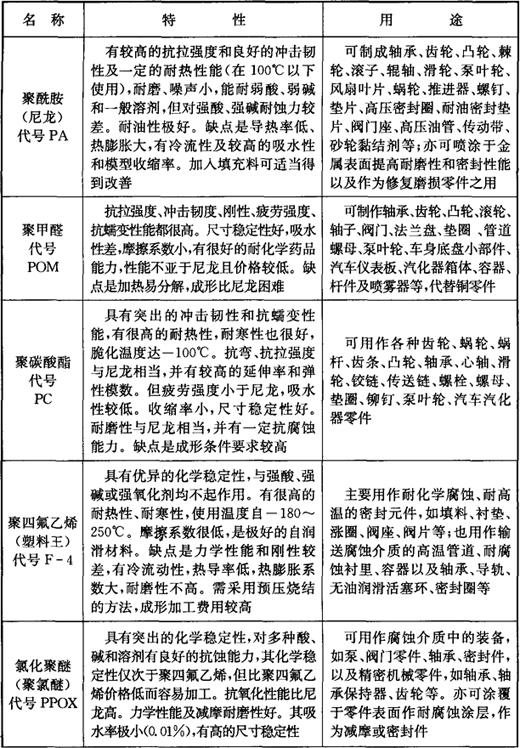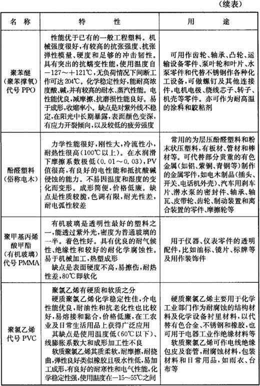 工程塑料的分类及品种见表2-37,常用工程塑料的特性及用途见表2-38。
