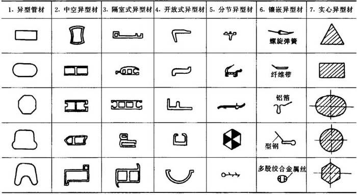 按异型材的软硬程度来分类,可分为软质异型材和硬质异型材。按塑料品种分类可分为:PVC异型材、ABS异型材等等,其中大多数是PVC异型材。然而,人们常用的分类方法是按异型材的结构来分类,见图12-1。按制品截面形状将塑料异型材分为:异型管材、中空异型材、隔室式异型材、开放式异型材、分节式异型材、镶嵌式异型材(复合式异型材)和实心异型材等。