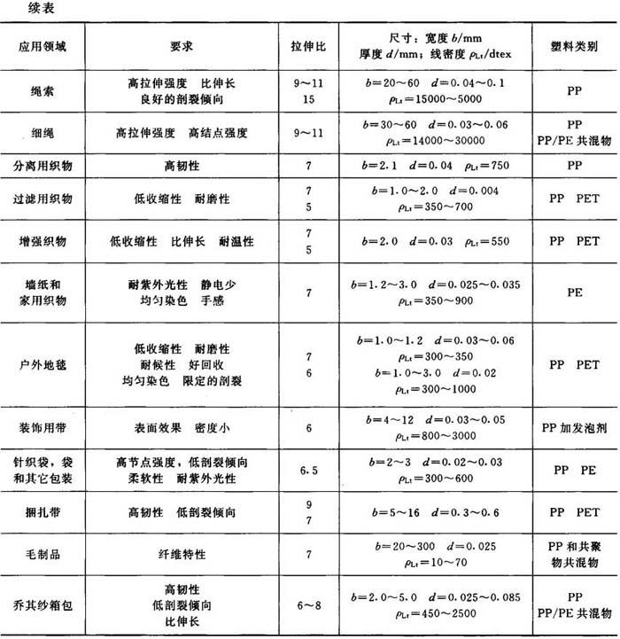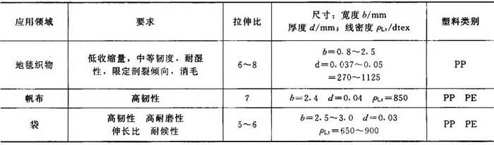 释义 | 塑料扁丝的特性及其应用 扁丝的性能(特别是韧度、伸长率和热收缩量)取决于挤出的冷却方式、冷却程度与取向度。目前,塑料扁丝几乎完全取代了相关领域中的天然产品。表11-8列举了扁丝的常规应用和对产品的主要要求、常规的拉伸比、通常的尺寸和塑料类型。 表11-8 塑料扁丝的应用领域和主要要求 注:在此表所阐述的扁丝的概念被拓宽了,包含了本章第四节和第五节将要论述的纤维和捆扎绳等制品。 |