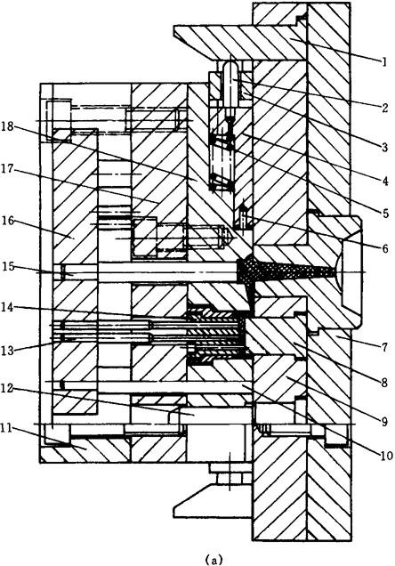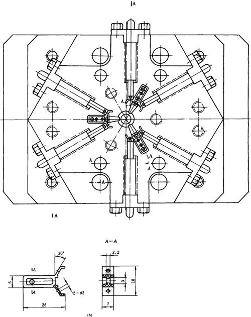释义 | 塑料拔杆注塑模具 制品呈叉形,并带有两个斜向孔。模具为一模三腔,从六个方向采用弹簧抽芯,结构较为简便。 开模时,当楔杆1脱离顶销2后,弹簧5推动滑块4使型芯6完成抽芯。顶出时,由推杆13、15将制品和浇注系统凝料顶出。 合模时,由楔杆1推动顶销2,弹簧5被压缩,从而使滑块4偕同型芯进入闭模状态,见图5-20。 图5-20(a) 塑料拔杆注塑模具主视图 图5-20(b) 塑料拔杆注塑模具俯视图及塑件 1—楔杆 2—顶销 3—挡板 4—滑块 5—弹簧 6—型芯 7—定模镶块 8—型芯 9—定模板 10—复位杆 11—支座 12—导柱 13—推杆 14—型芯 15—推杆 16—推板 17—支承板 18—动模板 |