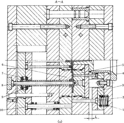 1—弹簧 2—复位杆 3—推板 4—推杆 5—定模镶件 6—动模镶件 7—推力轴承 8—型芯 9—推管 10—复位杆