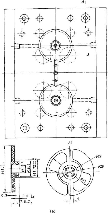 图5-1(b) 塑料螺旋齿轮注塑模具俯视图及塑件图