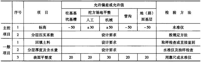 释义 | 填土的质量控制与检验 1.填土在施工过程中,应检查排水措施、每层的填筑厚度、土料的含水量和压实程序。 2.对有密实度要求的填方,在夯实或压实之后,要对每层回填土的质量进行检验,一般可采用环刀法(或灌砂法)取坪测定土的干密度,求出土的密实度,或用轻便的触探仪直接通过锤击来检验土的干密度和密实度,待符合设计要求后,才能填筑上层土料。 3.填土压实后的干密度,应有90%以上符合设计要求,其余10%的最低值与设计值之差,不得大于0.08g/cm3,并且不得集中。 4.填方施工结束后应检查标高、边坡坡度和压实程度等,检验标准见表1-28。 表1-28 填土工程质量检验标准 |