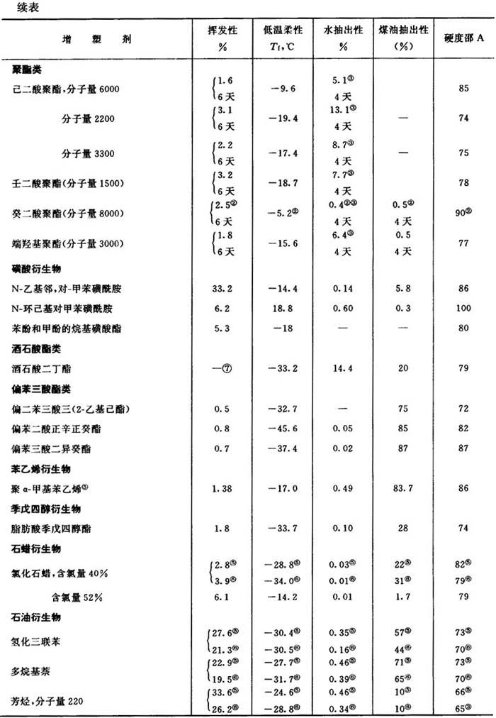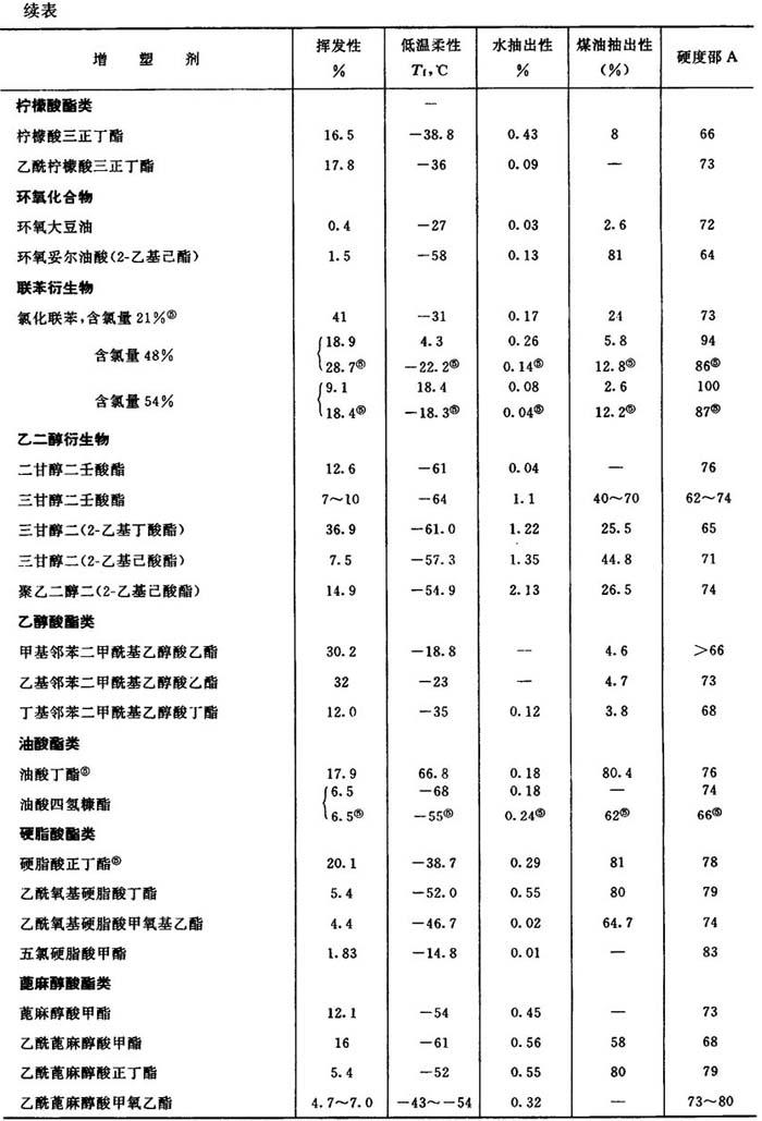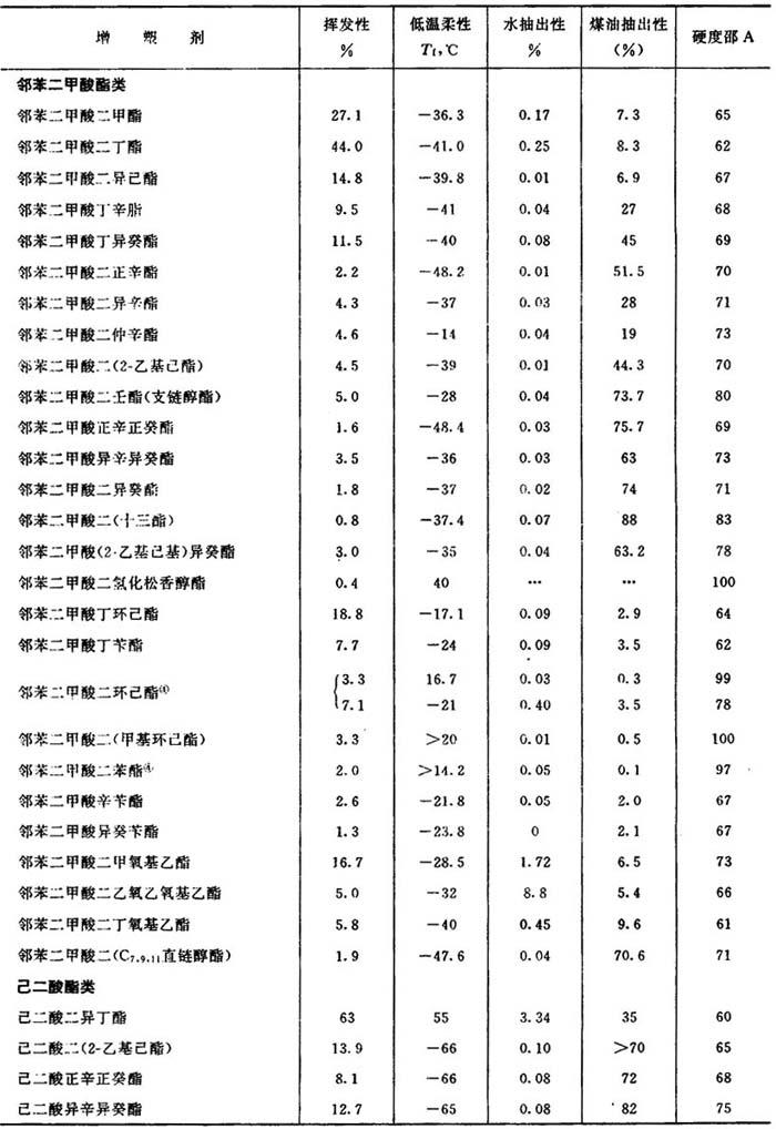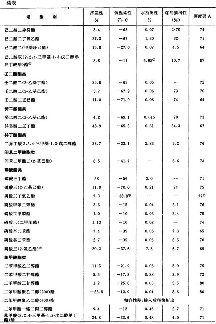 注:①表中所列数据除特别注明者外,均为在100份聚氯乙烯中加入67份增塑剂,压成1mm薄片所测试的数据,各项性能的测试方法如下: