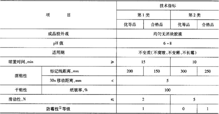 释义 | 壁纸胶粘剂 1.术语(表9-65) 表9-65 壁纸胶粘剂的相关术语 2.产品分类 (1)分类 壁纸胶粘剂按其材性和应用分为两大类。 第1类:适用于一般纸基壁纸粘贴的胶粘剂。 第2类:具有高湿粘性、高干强适用于各种基底壁纸粘贴的胶粘剂。 (2)代号 每类按其物理形态又分为粉型、调制型、成品型三种形态。第一类三种形态代号依次为1F、1H、1Y;第2类三种形态代号依次为2F、2H、2Y。 3.技术要求 壁纸胶粘剂技术要求应符合表9-66的规定。 表9-66 壁纸胶粘剂的技术要求 ①仅测防毒型产品。 |