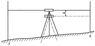 在读取后视读数和前视读数之间若仪器下沉了△,由于前视读数减少了△从而使高差增大了△(图2-24)。在松软的土地上,每一测站都可能产生这种误差。当采用双面尺或两次仪器高法时,第二次观测可先读前视点B,然后读后视点A,即以“后前前后”的顺序读数,则可使所测高差减小,两次高差的平均值可消除一部分仪器下沉的误差。用往测和返测时,同样也可消除部分的误差。