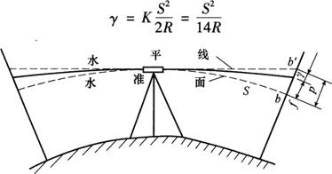 理论上水准测量应根据水准面来求出两点的高差(图2-25),但视准轴是一直线,因此使读数中含有由地球曲率引起的误差p: