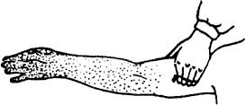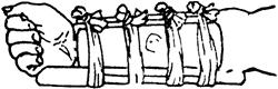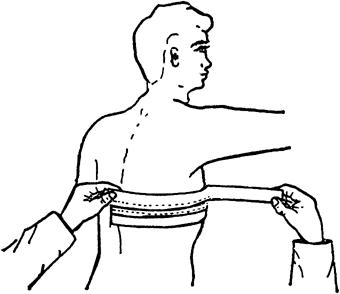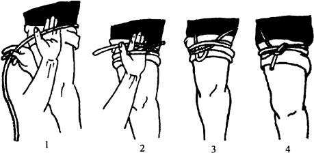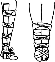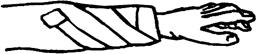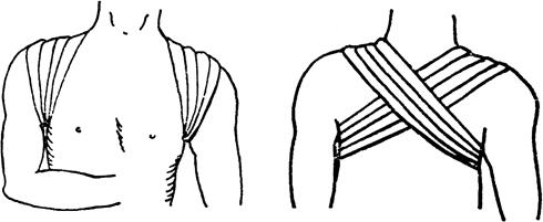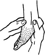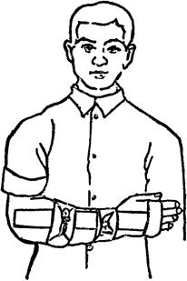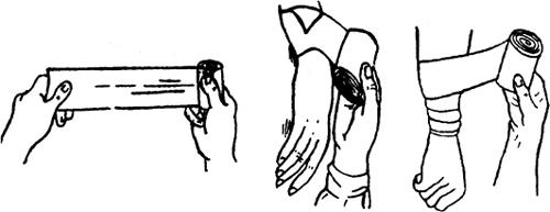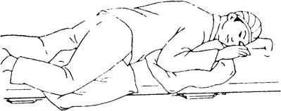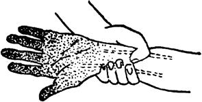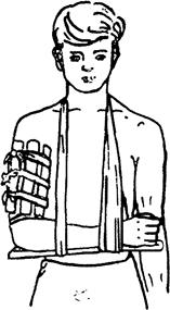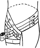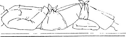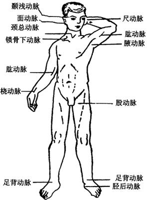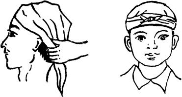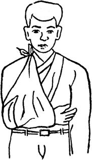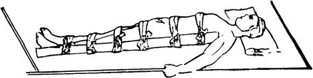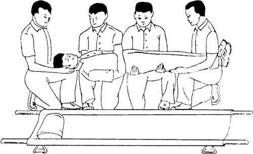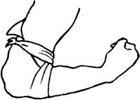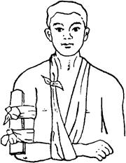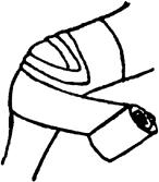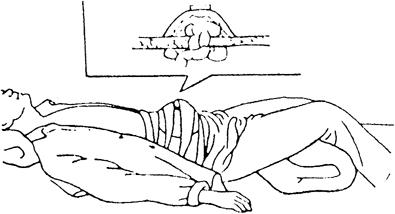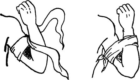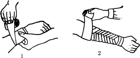 释义 | 外科止血包扎固定与搬运 一、止血法 患者遭受外伤后,常伴有严重的出血,救护人员应根据出血的颜色,性质和快慢,确定是动脉出血、静脉出血或毛细血管出血,采用不同措施迅速止血,以达到良好的效果。常用的止血方法有指压止血法、加压包扎止血法及止血带止血法。 (一)指压止血法 为迅速而有效地临时止血,则在出血点的近心端,根据出血部位及情况,用手指或手掌在有关的动脉上加压,使动脉在手与骨质间压瘪,以阻断血流,而达到止血的目的。指压止血操作要敏捷而准确,压力要适当。因此,要求护理人员熟悉人体解剖结构,熟练地掌握全身动脉主要指压点,是做好指压止血法的关键。常用的动脉指压止血点如图2-1~图2-7。 图2-1 全身动脉指压点 图2-2 颞浅动脉压迫止血 图2-3 颈总动脉压迫止血 图2-4 肱动脉压迫止血 图2-5 桡动脉压迫止血 图2-6 股动脉压迫止血 图2-7 足背动脉压迫止血 (二)加压包扎止血法 加压包扎止血法是抢救时最常用的止血方法,多用于小动脉、小静脉或毛细血管的出血。先在创面上覆盖无菌纱布,再盖上无菌棉垫或纱布垫,最后以绷带或三角巾做加压包扎。若出血点在肢体关节如肘窝、腘窝等处,覆盖纱布后垫以纱布卷或绷带卷,使关节尽量弯曲,然后用绷带或三角巾固定于屈曲位,则可达到止血的目的。如备有特制的急救敷伤包最为理想,包内有无菌纱布、棉垫和绷带,并备有止痛消炎粉、安全别针等。此种敷伤包紧贴伤口,即可达到加压止血、止痛和防止伤口感染等目的,使用时方便迅速。 肘窝压迫止血法,见图2-8。 图2-8 肘窝压迫止血法 (三)止血带止血法 止血带止血法是常用于四肢的一种紧急止血法,一般多采用橡皮条或橡胶管等有弹性的条带。有条件时用充气止血带更为理想,可按需要调节压力,避免橡胶管勒得太紧而使局部受损。在使用止血带时,均应衬垫纱布垫,避免与皮肤直接接触。当用充气止血带扎上后,须外加绷带固定数圈,防止打气加压后松开。充气注入的压力,成人、儿童、上下肢等均要有所区别,根据当时伤员的伤情及全身情况考虑。在一般情况下,成人下肢平均使用压力为350~500mmHg、上肢为250~300mmHg,小儿酌情减压,在现场抢救时多采用橡胶管止血带,也可就地取材,如稍宽的布条、三角巾、毛巾等,但禁用绳索等物。 止血带止血法如图2-9所示。 图2-9 止血带止血法 使用止血带应注意的事项: (1)选择好适应证。止血带仅用于四肢较大的动脉出血或用于加压包扎止血法无效者。 (2)上止血带的部位,上肢应在上臂的上1/3处,下肢应在大腿的上1/3处,上臂的中1/3不可扎止血带,以防伤及行走于肱骨后面的桡神经,引起上肢麻痹。 (3)上止血带应先加衬垫,如纱布、棉垫或毛巾、布巾,防止止血带勒伤皮肤或软组织。止血带松紧应适宜,以不能触及远端动脉搏动或伤口不再出血为原则。若压力不够,仅压住静脉,而动脉未完全压住,则出血更多。 (4)止血带每隔1h放松3~5min,持续时间过长,会导致神经或血管受伤,甚至引起肢体坏死。上止血带的伤员要有明显的标记,并注明上止血带的时间。在放松止血带期间,局部应加压,控制出血。 (5)前臂、小腿不宜上止血带,因有两骨,不能阻断骨间血管的血流,难于达到止血效果。 二、包扎法 包扎的目的是保护伤口,固定敷料及压迫止血等。一般多采用绷带及三角巾。 (一)绷带包扎法 绷带包扎法的种类,可分环形、螺旋形、蛇旋形、8字形、人字形、扇形、螺旋反折形。虽然绷扎法多种多样,但在急救时应按伤员损伤的部位及使用的目的进行选择。 1.环形 将绷带做环形的重叠缠绕,多用于胸、腹部和粗细相等之处(图2-10)。 图2-10 环形包扎法 2.蛇旋形 先将绷带做环形的缠绕,再将绷带以同样宽度的间隔斜着向上,多用于固定夹板及大量的敷料等(图2-11)。 图2-11 蛇旋形包扎法 3.螺旋形 将绷带在肢体上固定两圈,再由下而上缠绕,每圈盖住前圈1/3或2/3(图2-12)。 图2-12 螺旋形包扎法 4.8字形 将绷带由下而上,再由上而下,呈8字形来回缠绕,多用于弯曲关节的上、下两方(图2-13)。 图2-13 8字形和人字形包扎法 5.人字形将绷带先按照8字形缠绕,再以8字形一圈大一圈地缠下去,成为重叠的人字形。适用于肩部、腹股沟等部位(图2-13)。 6.扇形 按照8字形上下的缠绕成为扇形。此种缠法是以关节为中心,有向心性和离心性,离心性较向心性为好,不易滑脱。适用于肘关节、膝关节(图2-14)。 图2-14 扇形包扎法 7.螺旋反折形 在粗细不等的四肢,先用螺旋形缠绕,缠到肢体较粗的部位。就以螺旋反折形缠绕,每圈将绷带反折一下,并覆盖前圈1/3或2/3,由此渐渐向上缠绕。此法既平坦牢固,又整齐、美观(图2-15)。 图2-15 螺旋反折形 (二)三角巾包扎法 可用一米见方的布,斜分两开,即成为两个三角巾。三角巾上的直角称为顶角,两个45°角称左角和右角,斜边称基底,两直角边称侧缘。 使用三角巾时由于部位、目的不同,包扎方法也不同。如头部包扎,先将三角巾的基底折叠两层,宽2~4cm,将顶角拉到脑后,再将左角、右角绕到脑后先做一个半结,将顶角塞到结里,将折皱拉平,然后将左右角拉到前额做结(图2-16~图2-20)。 图2-16 头部三角巾包扎法 图2-17 肘部三角巾包扎法 图2-18 手部受伤三角巾悬吊法 图2-19 三角巾压迫颞动脉止血法 图2-20 手部三角包扎法 用于止血及固定敷斜,可将三角巾叠成条带状或小形三角巾,以压迫动脉或保