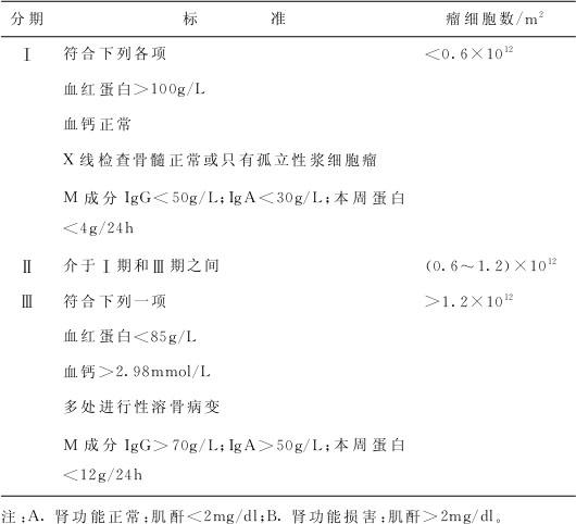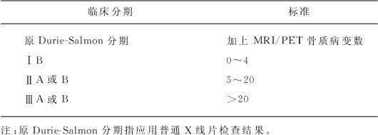 释义 | 多发性骨髓瘤 (一)概述 多发性骨髓瘤(multiple myeloma,MM)是浆细胞异常增生的恶性疾病,异常浆细胞(骨髓瘤细胞)浸润骨骼和软组织,产生异常单克隆免疫球蛋白(M蛋白)或免疫球蛋白片段,引起骨骼破坏、贫血、肾功能损害,而正常浆细胞分泌免疫球蛋白减少致免疫功能异常。 多发性骨髓瘤是原发于造血系统的恶性克隆性浆细胞病,发病率在恶性血液系疾病中仅次于淋巴瘤、白血病而居第3位。MM是中老年人疾病,几乎不发生于青少年。临床表现以贫血、骨痛、易发生感染为主要特征。MM属难治性疾病,预后不良。 (二)病因和发病机理 目前尚未完全阐明,以往的动物实验研究表明可能与遗传有关。淋巴巨噬细胞系统不断受到理化及生物原等慢性刺激(包括细菌、病毒),可能是浆细胞病的主要致病因素。此外,与IL—6生成失调引起浆细胞异常增生有关。MM患者的正常多克隆性免疫球蛋白合成与分泌受到抑制,表现为异常的单克隆免疫球蛋白大量增加,而正常免疫球蛋白显着减少。患者的免疫力明显下降,导致感染发生,肺炎最常见,其次是泌尿系感染。 (三)临床表现 MM的临床表现多样,在不同类型、不同病期及不同患者中,症状不同。典型表现是中老年发病,有贫血、骨痛(胸腹背痛最为多见)及反复感染(肺部感染最为常见)。此外,可有肾脏损害(多尿或少尿、蛋白尿、水肿)、高黏滞综合征(头晕、视力障碍、肢体麻木、肾功能不全、昏迷等)、高钙血症(头痛、呕吐、多尿、心律失常、昏迷等)以及淀粉样变性。胸椎或腰椎病理性骨折可造成截瘫。体征有皮肤黏膜苍白、舌体肥大、受累骨骼压痛及活动障碍、肝脾肿大、水肿等。 (四)诊断 1.病史 中老年人有不明原因的贫血、骨骼疼痛或反复感染。部分患者的首发症状为肾功能损害。 2.体格检查 骨骼压痛和活动受限是重要体征。贫血(皮肤黏膜苍白)、舌体肥大(淀粉样变性)也是常见的体征。约半数患者肝脏肿大,约20%患者脾脏肿大。 3.实验室检查 对MM的诊断有决定性意义。骨髓穿刺发现有骨髓瘤细胞。血清蛋白电泳、免疫电泳证实有单克隆免疫球蛋白或单克隆免疫球蛋白轻链。X线检查显示受累骨骼普遍性骨质疏松和(或)溶骨性病变。此外,红细胞沉降率显着增快、血钙升高、血尿酸增多、血液黏滞性增高、β2微球蛋白增多、肾功能不全以及淀粉样变性都可见于本病。 (五)诊断标准 1.国内诊断标准 (1)骨髓中浆细胞>15%并有原浆或幼浆细胞,或组织活检证实为浆细胞瘤。 (2)血清单克隆免疫球蛋白(M蛋白)IgG>35g/L,IgA>20g/L,IgM>15g/L,IgD>2g/L,lgE>2g/L;尿中单克隆免疫球蛋白轻链(本周蛋白)>lg/24h。 (3)广泛骨质疏松和(或)溶骨病变。 符合第(1)和第(2)项即可诊断MM,符合上述所有3项者为进展性MM。诊断IgM型MM时,要求符合上述所有三项并有其他MM相关临床表现。符合第(1)和第(3)项而缺少第(2)项者,属不分泌型MM,应注意除外骨髓转移癌,若有可能应进一步鉴别属不合成亚型抑或合成而不分泌亚型。 2.国外诊断标准 (1)世界卫生组织(WHO)2001年公布了MM诊断标准。 1)MM的诊断需具备下列1项主要指标和1项次要指标,或者具备下列3项次要指标,但其中必须包含第①项和第②项次要指标,而且患者应有MM相关临床表现。 2)主要诊断指标 ①骨髓中浆细胞增多>30%。 ②活检证实为浆细胞瘤。 ③M成分:血清IgG>35g/L;IgA>20g/L;尿本周蛋白>1g/24h。 3)次要诊断指标 ①骨髓中浆细胞增多10%~30%。 ②M成分存在但水平低于主要诊断指标。 ③有溶骨性病变。 ④正常免疫球蛋白减少(正常<50%):IgG<6g/L;IgA (2)WHO同时还制订了冒烟型骨髓瘤(smoldering myeloma,SMlM)和惰性骨髓瘤(indolent myeloma,IMM)的诊断标准。 1)WHO诊断SMM标准 ①血清M蛋白水平达到诊断MM水平。 ②骨髓中浆细胞10%~30%。 ③无溶骨性病变。 ④无骨髓瘤相关症状。 2)WHO诊断IMM标准 ①骨髓中浆细胞>30%或活检证实为浆细胞瘤。 ②血清M蛋白IgG<70g/L或IgA<50g/L。 ③溶骨性病变≤3处且无压缩性骨折。 ④血红蛋白、血钙、肌酐水平正常。 ⑤无感染。 (3)MM临床分期标准:临床分期反映MM病程早晚和肿瘤负荷,与治疗及预后有关,故当MM的诊断确定之后,应进一步明确患者的临床分期。自20世纪70年代以来临床上广泛采用的Durie和Salmon分期标准目前仍在沿用(表5—10)。 表5—10 Durie—Salmon分期标准 近年来,影像学有了长足进步,MRI、PET、PET—CT在检测骨质病变上远较普通X线片敏感。因此,Durie在原来Durie—Salmon分期标准上加入了上述影像学检查,制订了Dutie—Salmon Plus分期标准并发表于2006年(表5—11)。 表5—11 Durie—Salmon Plus分期标准 (4)近年来众多研究证明β2微球蛋白(β2—m)和白蛋白水平对MM的临床分期和预后有关键意义。 国际骨髓瘤基金会(international myeloma Foundation)25位专家根据对10750例患者资料的荟萃分析,于2005年提出了最新MM国际分期标准(ISS)。 Ⅰ期:β2微球蛋白<3.5mg/L,白蛋白>3.5g/L。 Ⅱ期:介于Ⅰ期和Ⅲ期之间。 Ⅲ期:β2微球蛋白>5.5mg/L。 (六)鉴别诊断 1.MM是最易被误诊的疾病之一,据国内研究发现误诊率高达60%以上。其原因有3种:①缺乏有关MM的专业知识或缺乏对MM的謦惕性;②MM的临床表现多样而不具特异性;③缺乏实验室检查设备(如蛋白电泳、免疫电泳、轻链定量等)。其中第一条原因最关键。遇到可疑病例,做蛋白电泳、骨髓穿刺,则可避免误诊或漏诊。 2.老年患者发生原因不明的反复肺部感染,或有不明原因的红细