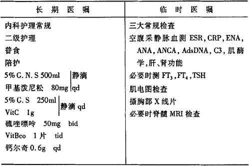 说明:(1)甲基泼尼松静滴5日后,改为大剂口服量(60mg/d),显效后逐渐减量,先快后慢,小剂量维持。