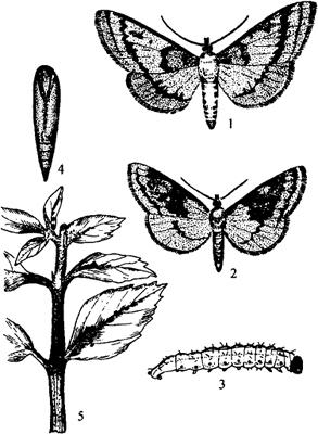 【形态特征】 成虫中小型蛾,黄褐色,体长13~15毫米,翅展25~35毫米。前后翅均横贯2条明显波纹,中间有大小两块暗斑。飞翔时,前后翅波纹相连;静止时,左右翅波纹相接。雌体肥大,色较黄,翅面波纹浅褐色。雄体瘦削,色较深,翅面波纹暗褐色(图5-94)。卵扁平椭圆形,黄白色。长约1毫米。老熟幼虫体长约19毫米,圆筒形。头红褐色,背中央有1条明显的褐色细线,各节背上有4个较大的肉瘤,上生毛刺。蛹纺锤形,黄褐色或红褐色,末端有小钩5~8个。