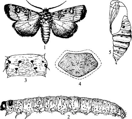 释义 | 大地老虎 【学名】 Agrotis tokionis Butler。 【分布与为害】 在长江流域发生较多,北方较少。食性很杂,许多花木幼苗均可受其害。 【形态特征】 成虫体长20~25毫米,翅展40~52毫米。头、胸部褐色,腹部灰黑色。雌蛾触角丝状,雄蛾触角栉齿状。栉齿分枝较长,向端部逐渐短小。颈板中部有1条黑横线。前翅灰褐色,前缘自基部至2/3处黑褐色。肾状纹及环纹明显,其周围有黑褐边。肾状纹外侧有1不规则黑纹。亚基线、内、外横线均为双条曲线。有时,中横线、亚外缘线极不明显(图6-37)。卵为半球形,直径1.8毫米,浅黄色,变褐、灰褐色。老熟幼虫体长40~60毫米,黄褐色,体表多皱纹,颗粒微小。腹部第一至三节背面中部有4个毛片,前2个稍小。臀板密布龟裂状皱纹,除末端2根刚毛附近,几乎全部为深褐色。腹足趾钩5~14个。蛹长23~29毫米,赤褐色。腹部第一至四节侧面有明显横沟,第三至五节比中胸及腹部第一、二节为粗。第四至七腹节基部密布刻点。第五至七腹节刻点环绕一周。腹末臀棘呈三角形,具短刺1对。 图6-37 大地老虎 1.成虫 2.幼虫 3.幼虫第四腹节背面 4.幼虫臀板 5.蛹 【生活习性】 1年发生1代。以3~6龄幼虫在土中或草丛内潜伏越冬。在北京翌年4月活动,为害剧烈。6月幼虫老熟,在土下3~5厘米处筑土室越夏,长达3个月左右。8月开始化蛹,9月中旬出现成虫、10月上旬开始产卵,10月下旬开始越冬。南方3月中旬至4月上旬越冬幼虫活动为害,5~6月幼虫夏眠,5~9月,夏眠后虫体在土室化蛹。 成虫夜间活动,有趋糖、酒、醋习性。成虫交尾后次日即可产卵。每雌虫产卵648~1486粒。卵产于土表或杂草上。4龄后伏于土表下,夜出为害。在-5~-10℃,越冬幼虫几天死亡。越夏幼虫对高温有较高抵抗力,但如果土壤过干、过湿或土室因翻耕所破坏,死亡率很高。 【防治方法】 (1)发蛾盛期点黑光灯、或糖醋酒液诱杀。糖、醋、酒、水配比为1∶1∶0.2∶0.4再加入0.1%敌百虫。置盒内,挂1米高处,白天加盖,晚上开盖。每隔1~2天加1次糖醋配制液。 (2)清除杂草,防止成虫产卵和幼虫转移幼苗上为害。 (3)新鲜泡桐叶浸入90%敌百虫1000倍液后,置70m2栽植地8~10张叶片,3~5天可杀幼虫达95%。 (4)用75%辛硫磷1000倍液,拌鲜草50千克于晚上撒入栽植地杀幼虫。 |
