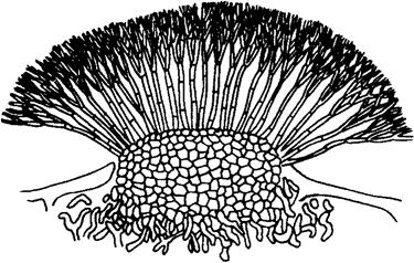 释义 | 大岩桐腐烂病 【症状】 主要为害叶、茎和幼株。在叶片上产生水渍状暗褐色坏死斑,有因颜色深浅不同呈现的轮纹。为害严重时,上部的茎歪曲和矮化。成株在近地茎上产生大而黑色凹陷病斑,并易开裂。在潮湿情况下,病斑上和叶片的下方长出小黑点,排列略呈轮纹状,边缘有白色菌丝。 【病原】 为半知菌类黑粘座孢霉属的Myrothecium roridum Tode ex Fr.。分生孢子堆垫状,从寄主的表皮或角质层下的子座或直接从菌丝上生出。分生孢子梗丛生,上部帚状分枝,顶端轮生3~7个瓶形小梗。分生孢子生于顶端,单胞椭圆形,初无色,后呈深绿色,成堆时为墨绿色,埋于胶液内(图8-13)。 图8-13 大岩桐腐烂病的病原菌 【发病规律】 病菌寄生性弱,但寄主范围广泛,为害性较大。能严重引起观赏植物,如花叶万年青、珠兰、胡椒草、冷水花等的颈腐病。病菌常从伤口侵入,过度潮湿有利于病害的发生发展。 【防治方法】 精细管理和清洁卫生,及时拔除病株。避免用水过多和直接对植株喷浇。用甲醛与水3∶1喷洒土表,薄膜覆盖,至种植前3天揭开薄膜,或用70%敌克松粉剂70分与30分细土混和撒入田园进行土壤消毒。 |