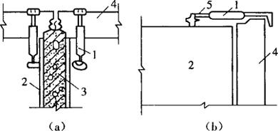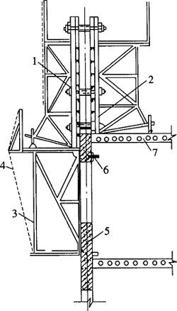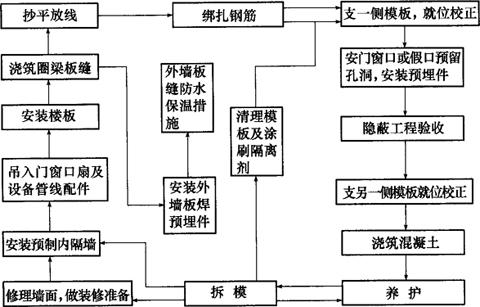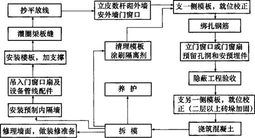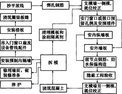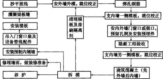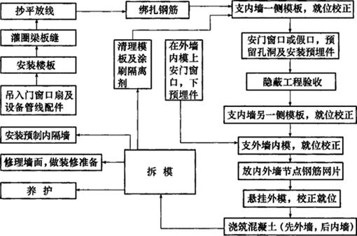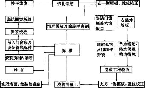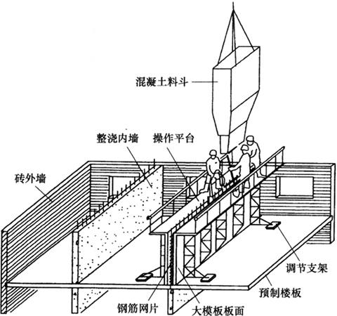 释义 | 大模板的施工 大模板工程施工的机械化程度高,不同的组合方案具有不同的施工程序和施工方法,必须根据其工艺特点,合理地进行施工组织设计,保证工程施工有条不紊地开展。 (一)内外墙全现浇的大模板施工 采用内外墙现浇大模板施工,建筑物的施工缝很少,结构的整体性好,造价比外墙预制低。但模板型号较多,支模工序复杂,湿作业相应较多,模板周转较慢,高空作业危险。 1.施工材料 外墙外混凝土可分为两种,一种是采用轻集料混凝土,另一种是采用普通混凝土。内墙一般是采用普通混凝土。 当内墙采用普通混凝土、外墙采用轻集料混凝土时,由于两种混凝土的密度和收缩率不同,在接缝处容易出现裂缝,一般应采用先浇内墙后浇外墙的方法。当内外墙同时浇筑时,应在内外墙交接处设置钢板网,防止内墙混凝土流入外墙,影响外墙的热工性能,同时也避免发生裂缝。 当内外墙均采用普通混凝土时,由于外墙的热工性能比较差,在华北、西北和东北等地区,对外墙应进行隔热保温处理。 2.施工程序 (1)采用悬挂式外模时的施工程序如图9-17所示。 (2)采用外承式外模时的施工程序如图9-18所示。 图9-17 采用悬挂式外模时的施工程序 图9-18 采用外承式外模时的施工程序 3.支模特点 (1)外墙支模 内外墙全现浇大模板的施工,外墙的外侧的支模是施工的重点和难点。外墙的内侧模板与内墙模板一样,支撑在楼板上,相对比较容易。外墙的外模板有悬挑式和外承式两种。 1)悬挑式外模板施工。当采用悬挑式外模板施工时,其支模的顺序为:先安装内墙模板,再安装外墙的内模板,然后将外模板通过内模板上端的悬臂梁直接悬挂在内模板上。悬臂梁可采用一根槽钢焊在外侧模板的上口横筋上,内外墙模板之间用两道对销螺栓拉紧,下部靠在下层外墙混凝土壁上,如图9-19所示。 图9-19 悬挑式外模板示意图 1-外墙外模板;2-外墙内模板;3-外墙内模板 2)外承式外模板施工。当采用外承式外模板施工时,可将外墙的外模板安装在下层混凝土外面上挑出的支撑架上,如图9-20所示。支撑架可制成三角架,用L型螺栓通过下一层外墙预留孔挂在外墙上。为了保证安全,要设防护栏杆和安全网。外墙的外模板安装好后,再安装内墙模板和外墙外模板。 图9-20 外承式外模板示意图 1-外墙外模板;2-外墙内模板;3-外承架;4-安全网;5-现浇外墙;6-穿墙卡具;7-楼板 (2)门窗洞口支模 全现浇结构的外墙门窗洞口处的模板,宜采用固定在外墙内模板上的活动折叠模板。门窗洞口模板与外墙模板用合页连接。洞口模板支好后,用固定在模板上的钢支撑顶牢。 (二)内浇外挂的大模板施工 这种结构体系是我国采用较早的大模板工程,由于它将预制装配化和现场机械化施工结合起来,能充分发挥各自的特点,从而减少了高空作业和模板配置,也有利于外墙综合功能的处理,是目前应用比较广泛的一种施工形式。 1.施工程序 由于内浇外挂结构体可以分为:预制承重的外墙板,而内墙采用现浇;或者预制非承重外墙板,而内墙采用现浇;或者预制承重外墙板和非承重内纵墙板,而内墙采用现浇三种。所以,它们的施工程序是不同的 预制非承重外墙板及内墙采用现浇的施工程序如图9-21所示;预制承重的外墙板及内墙采用现浇的施工程序如图9-22所示;预制承重外墙板和非承重内纵墙板及内墙采用现浇的施工程序如图9-23所示。 图9-21 预制非承重外墙板及内墙采用现浇的施工程序 图9-22 预制承重的外墙板及内墙采用现浇的施工程序 图9-23 预制承重外墙板和非承重内纵墙板及内墙采用现浇的施工程序 2.施工工艺 (1)抄平放线 抄平放线工作是确保墙体位置正确、进行安装模板的标准,主要包括轴线、墙身线、模板就位线,门口、隔墙、阳台位置及抄水平线等。 大模板在安装之前,应将轴线从标准轴线桩引至外墙上口,再引至楼板面作为楼面轴线的依据;根据轴线放出内外墙的轴线,弹出墙身线、模板的就位线,作为安装大模板的依据,同时弹出门窗洞口、隔墙、阳台等的安装线。 每幢建筑物在适当位置应设置1~2个标准水平桩,作为施工标高控制的依据。在安装大模板前,将水平标高引测到建筑物的第一层墙上,作为控制水平线,各楼层的标高均应以此线为基线,用仪器或钢尺引测上去,每个楼层设两条水平线,一条离地面50cm,供装修工程使用;另一条距楼板下皮10cm,用以控制墙体顶部的找平层和楼板安装标高。另外,有时需要在墙体钢筋上也弹上水平线,用以控制大模板安装的水平度。 (2)绑扎钢筋 大模板施工的墙体宜用点焊钢筋网片,网片间的搭接长度和搭接部位均应符合设计中的规定。点焊好的钢筋网片在堆放、运输和吊装过程中,应采取措施防止钢筋产生弯折变形和点焊脱落。上下层墙体钢筋的搭接部分应当顺直,并绑扎牢固。双排钢筋网片之间应设置绑扎定位连接钢筋;钢筋与模板之间应绑扎砂浆垫块,其间距不宜大于1m,以确保钢筋位置准确和墙体保护层厚度。 在外墙模板安装前,应将两侧伸出的钢筋套环理直。在外墙模板就位后,两块外墙模板的套环和内墙的钢筋套环应重合,将本层的竖向钢筋插入内外墙重合的套环内,对每块外墙板和内墙,插入的套环不得少于3个,并确实绑扎牢固。 (3)大模板的处理与安装 大模板进至安装现场后,首先应做好模板安装前的一切准备工作。认真核对模板型号、清点数量,在模板背面进行
